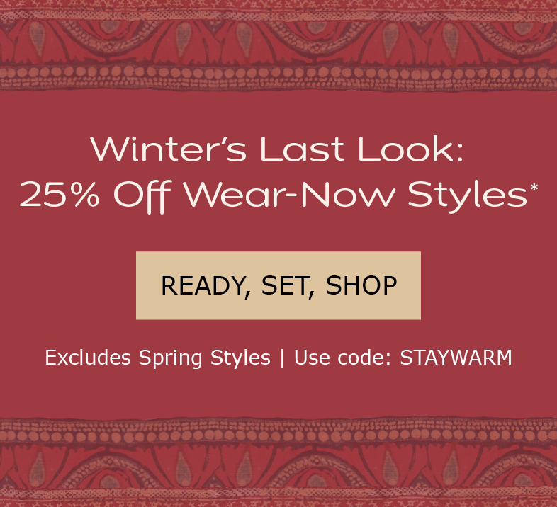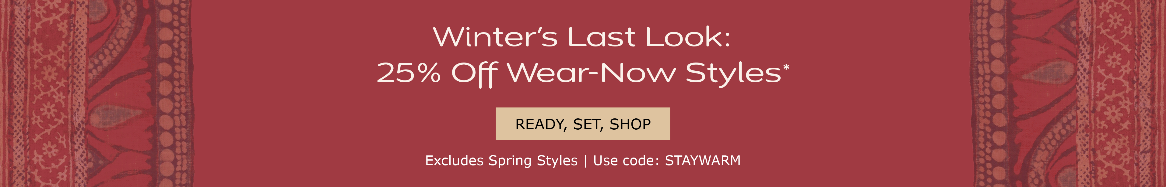 *25% off in-stock wear now winter styles: This offer is valid on new orders only found on our Special Savings Event page or find the 25% off badge. All other products are not valid for the 25% offer. The offer is not valid on previous purchases or exchange orders and cannot be combined with other offers. The discount cannot be applied for the purchase of gift cards, new arrivals or backordered merchandise. Discount will be applied in the shopping cart, or at checkout by using code STAYWARM. Offer is valid 12:00am CST Thursday, February 19 until 11:59pm CST Friday, March 6, 2026.