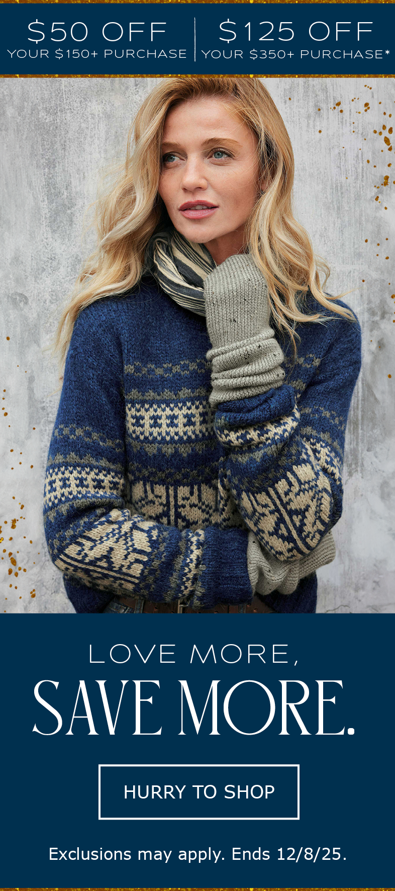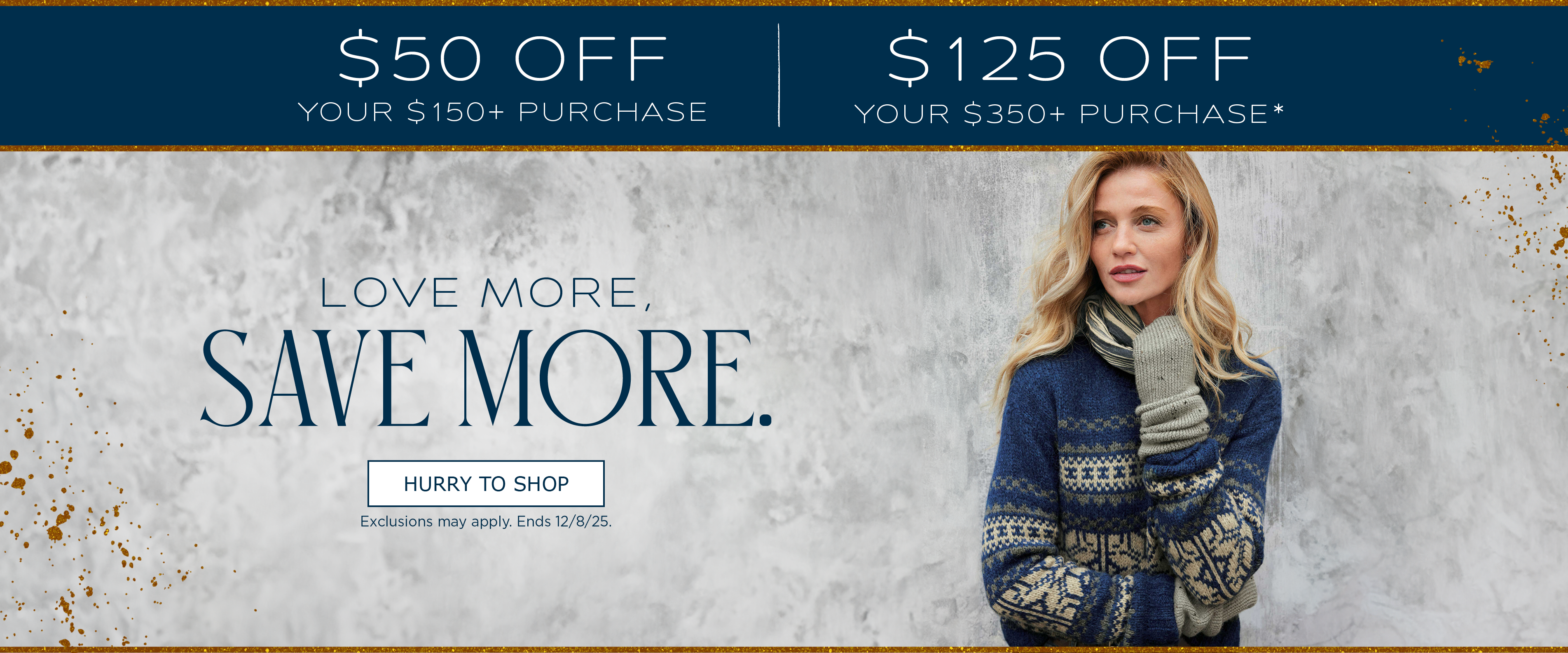 * $50 off your next $150+ purchase or $125 off your next $350+ purchase: Valid on new orders only, while supplies last. Offer cannot be combined with other offers and is not valid on previous purchases, exchange orders or gift cards. Single use per customer. This offer is valid from 12:00 am CST Monday, December 1 until 11:59 pm CST Monday, December 8, 2025.
