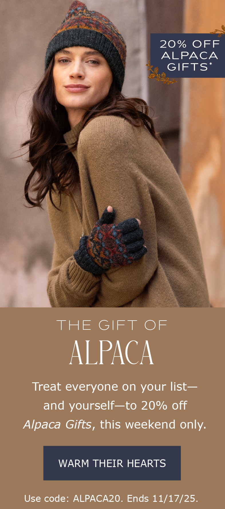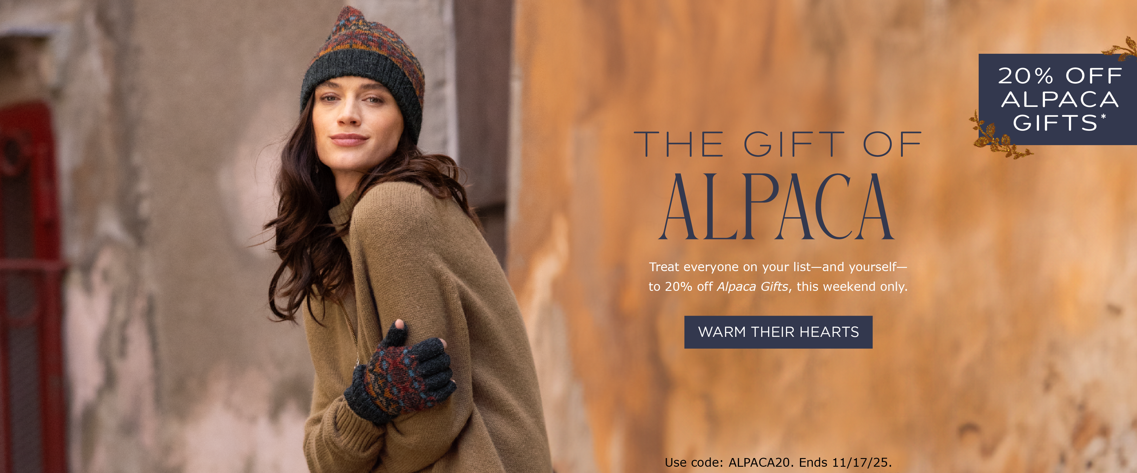 * 20% off select alpaca styles: To receive 20% off select alpaca styles, use code ALPACA20 at checkout. Valid on styles only found at this webpage linked here. Valid on new orders only, while supplies last. Offer cannot be combined with other offers and is not valid on previous purchases or exchange orders. This offer is valid from 12:00 am CST Friday, November 14 until 11:59 pm CST Monday, November 17, 2025.