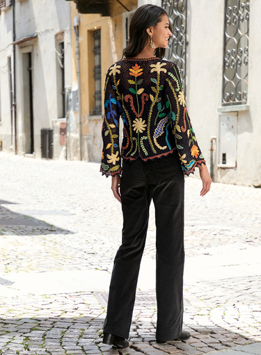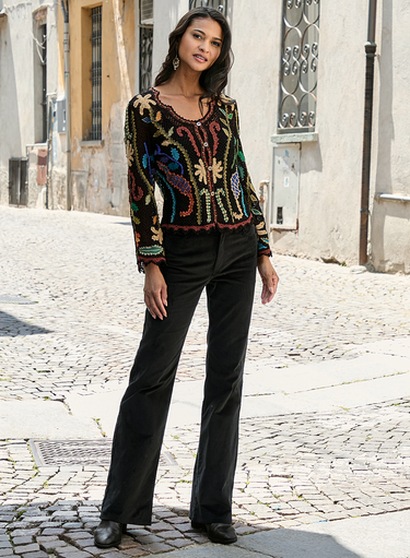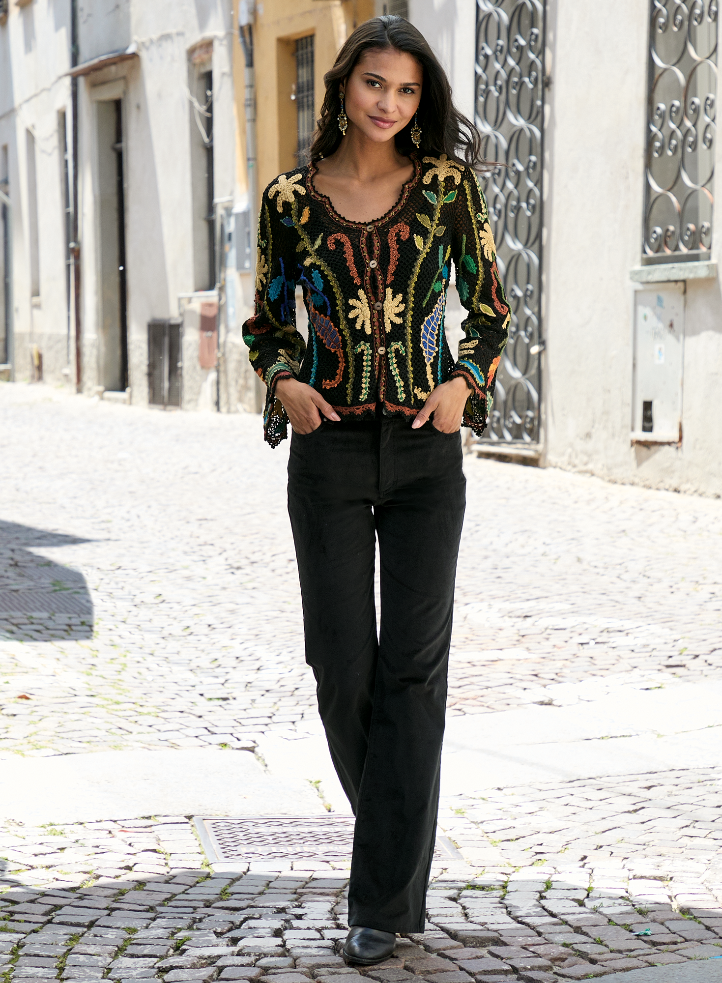 Our plush, stretchy velveteen jeans in luminous colors have a comfortable mid rise and gently flared legs. Classic five-pocket styling.