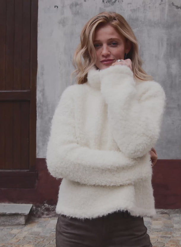 A luxury sweater to live in, knit with thick, fluffy alpaca blend yarns for exceptional loft and texture. The easy silhouette has drop shoulders, a funnel T-neck and long sleeves.