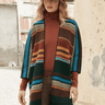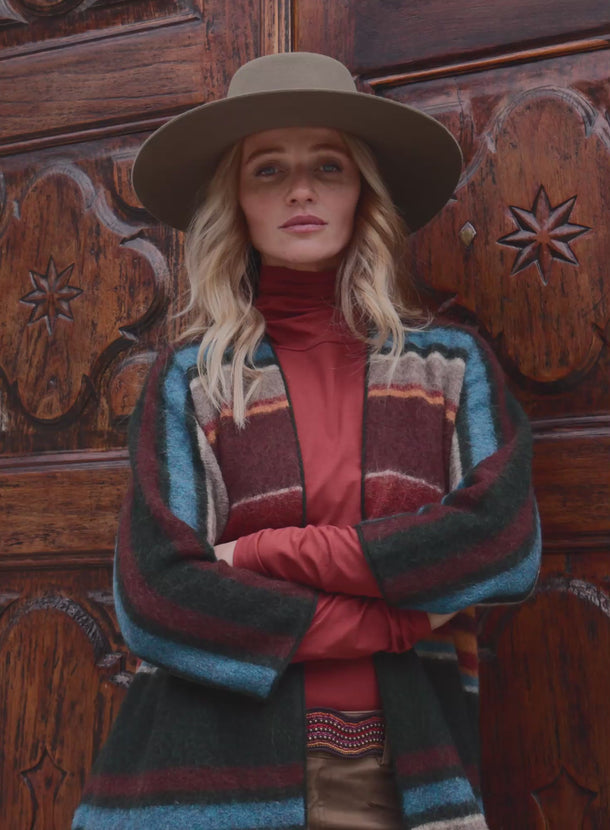 A sensational show-stopper, our boiled knit cardigan pays tribute to traditional Peruvian artisan textiles. Superbly crafted of brushed baby alpaca, the oversized silhouette is knit with classic blanket stripes and Andean manta motifs in bold, brilliant hues with hand-tied fringe at hem. Styled with a V-neck and 3/4 sleeves.