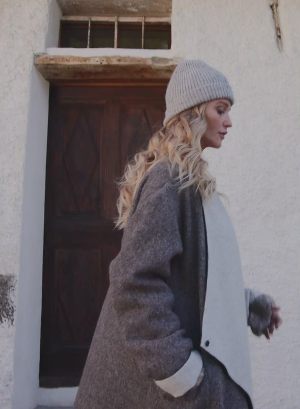 A lofty layer of luxury, our drape-collared coat is woven of double-faced alpaca and wool. The generous coat is minimally styled: unstructured and unlined, with tab button closures and patch pockets. Can be worn multiple ways; draped open, buttoned at the shoulder for enveloping warmth or closed at the waist with a drapey collar.