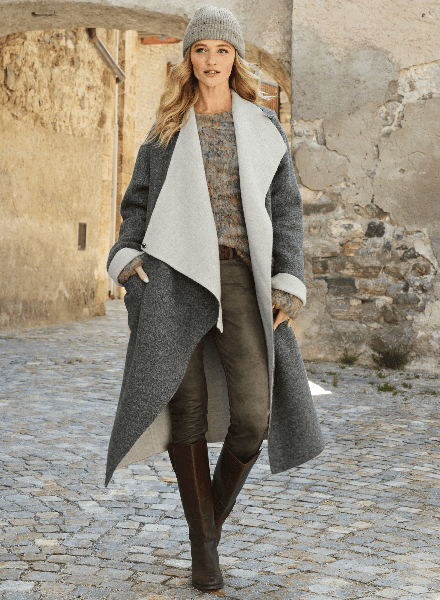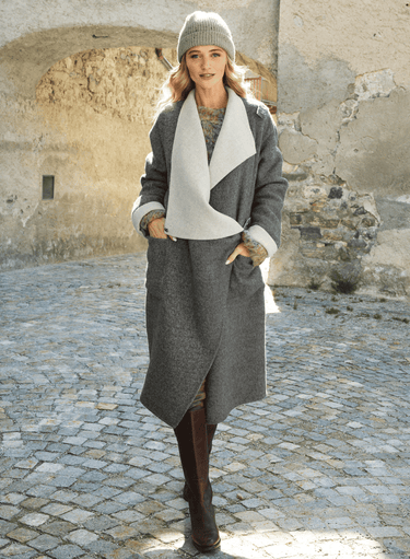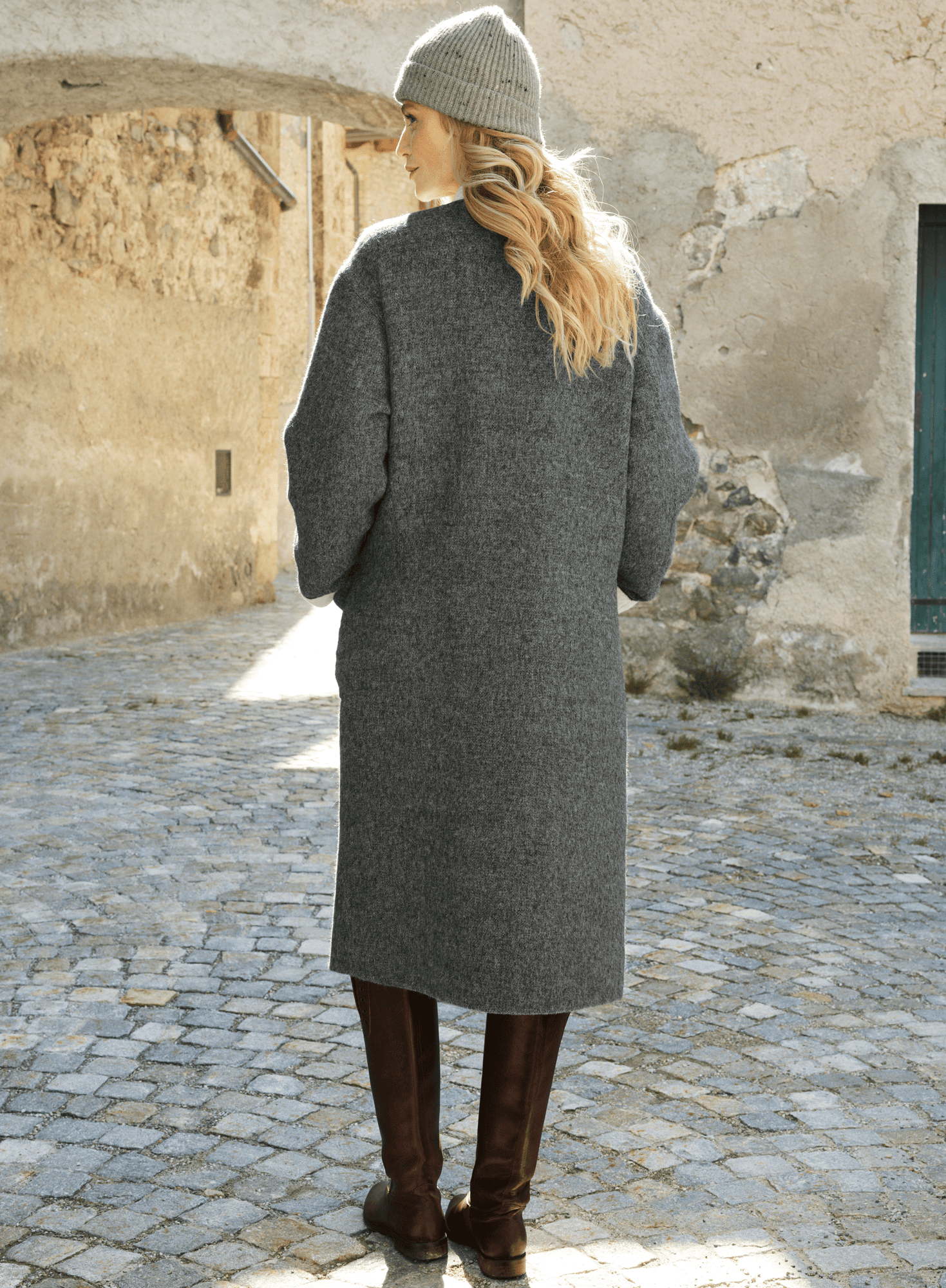 A lofty layer of luxury, our drape-collared coat is woven of double-faced alpaca and wool. The generous coat is minimally styled: unstructured and unlined, with tab button closures and patch pockets. Can be worn multiple ways; draped open, buttoned at the shoulder for enveloping warmth or closed at the waist with a drapey collar.