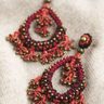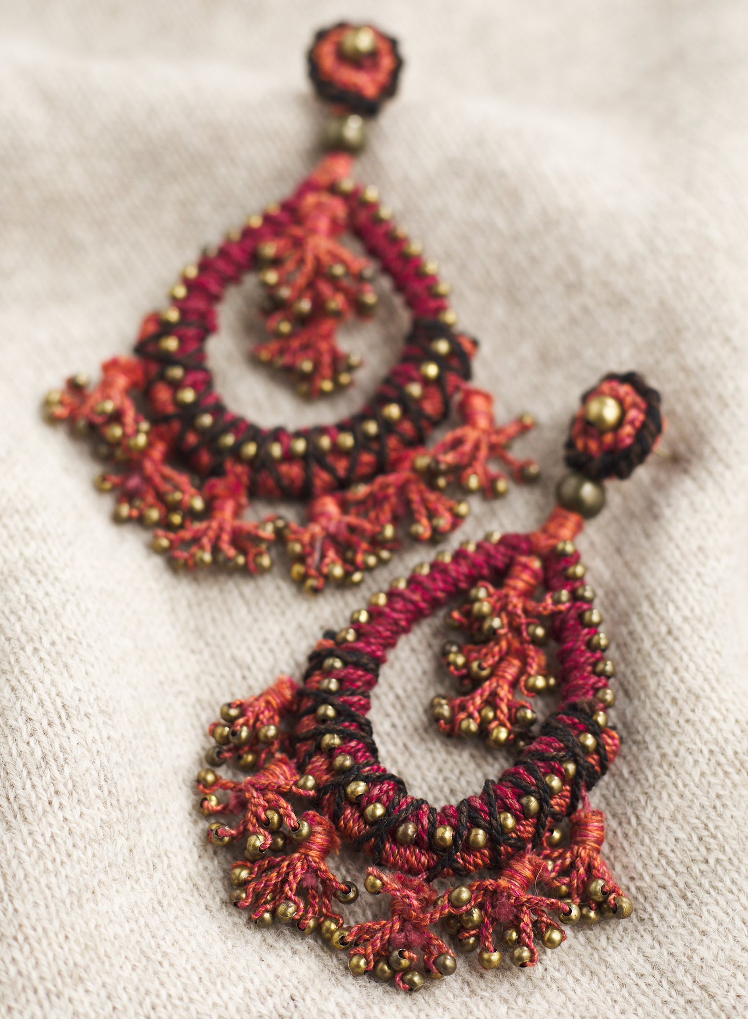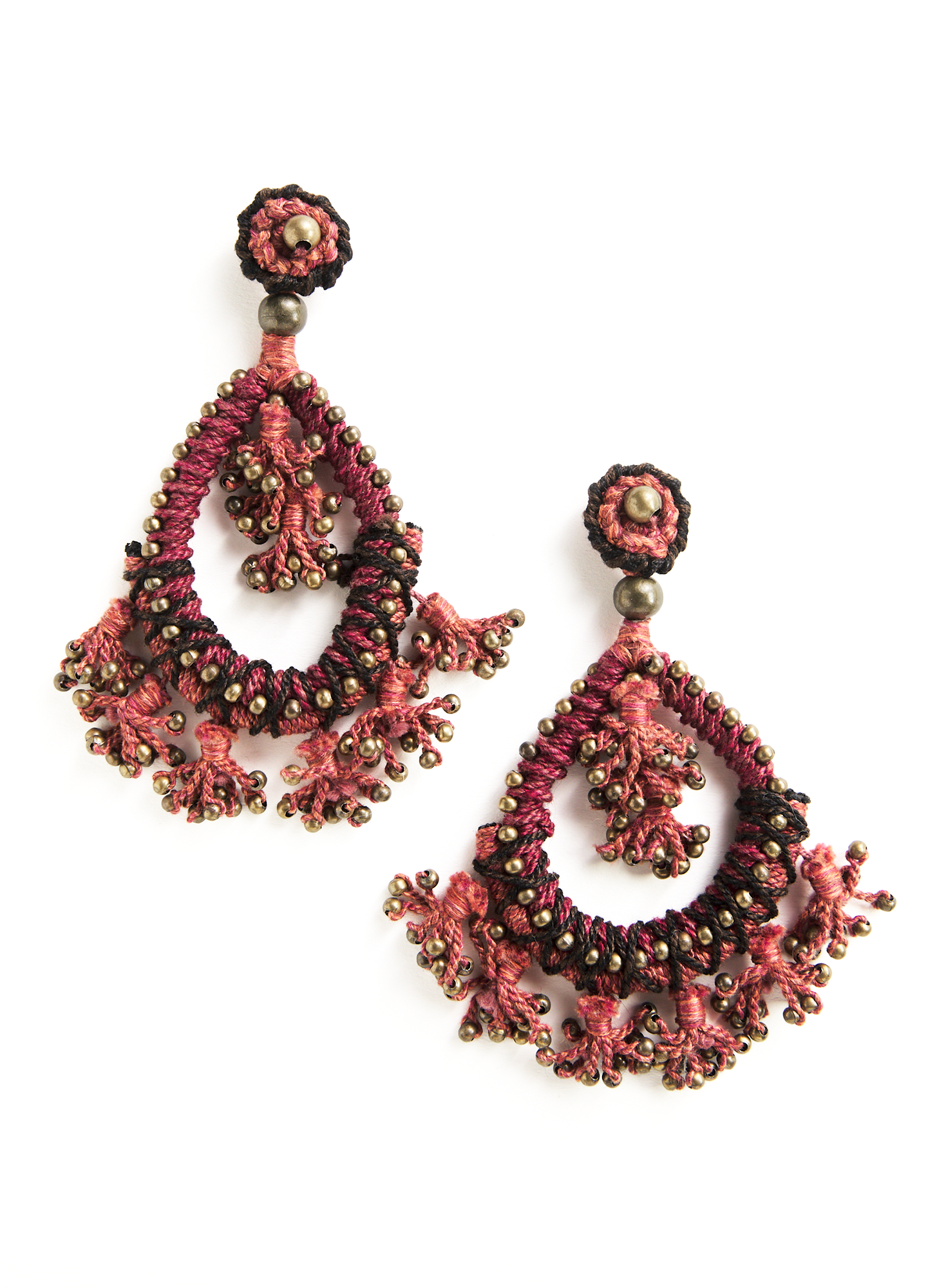 Elegant hand-crocheted earrings are crafted by Peruvian artisans in brandy, ruby, paprika, lavender and black Pima cotton; decorated with bronze beads. Pierced.
