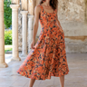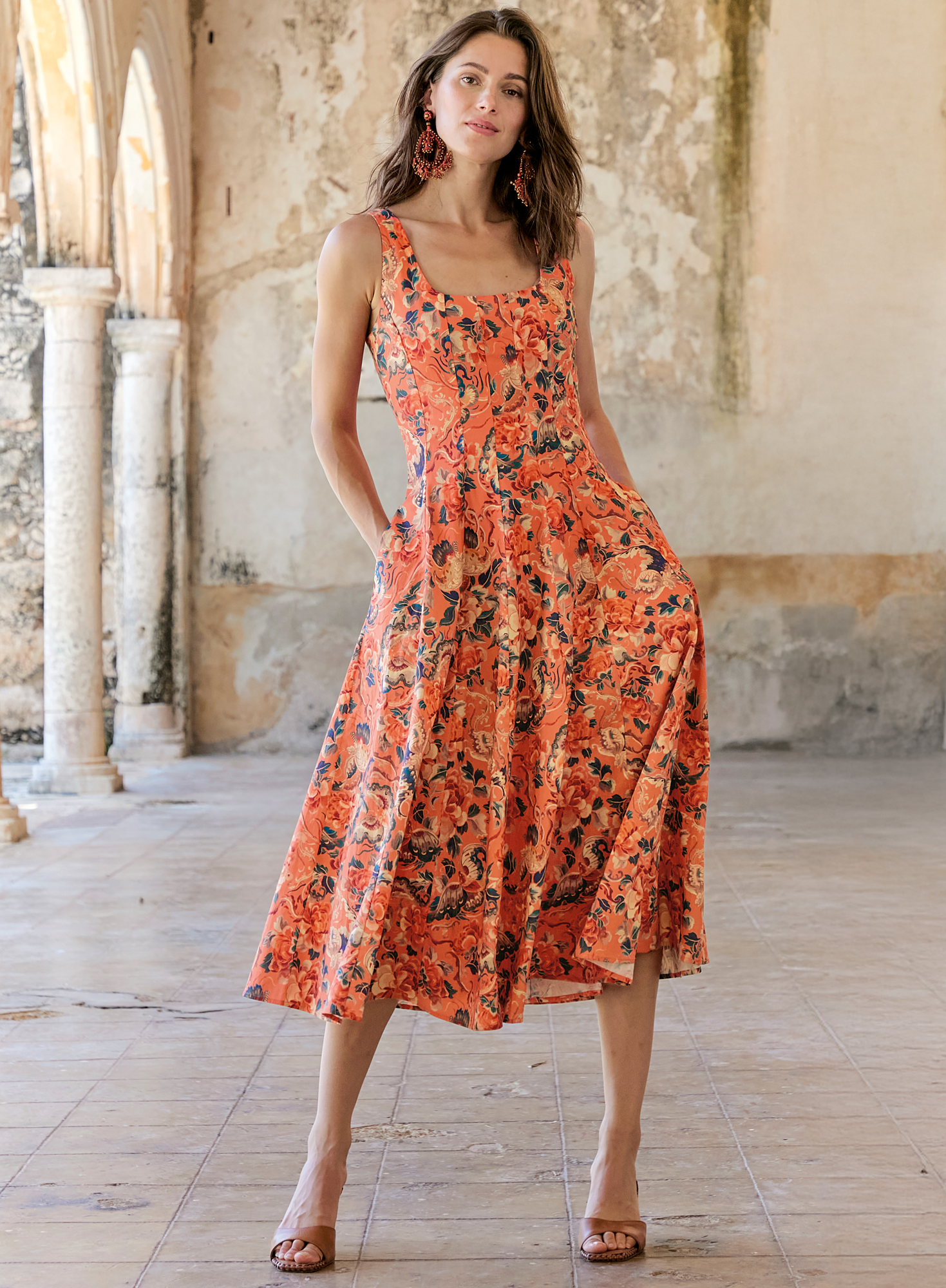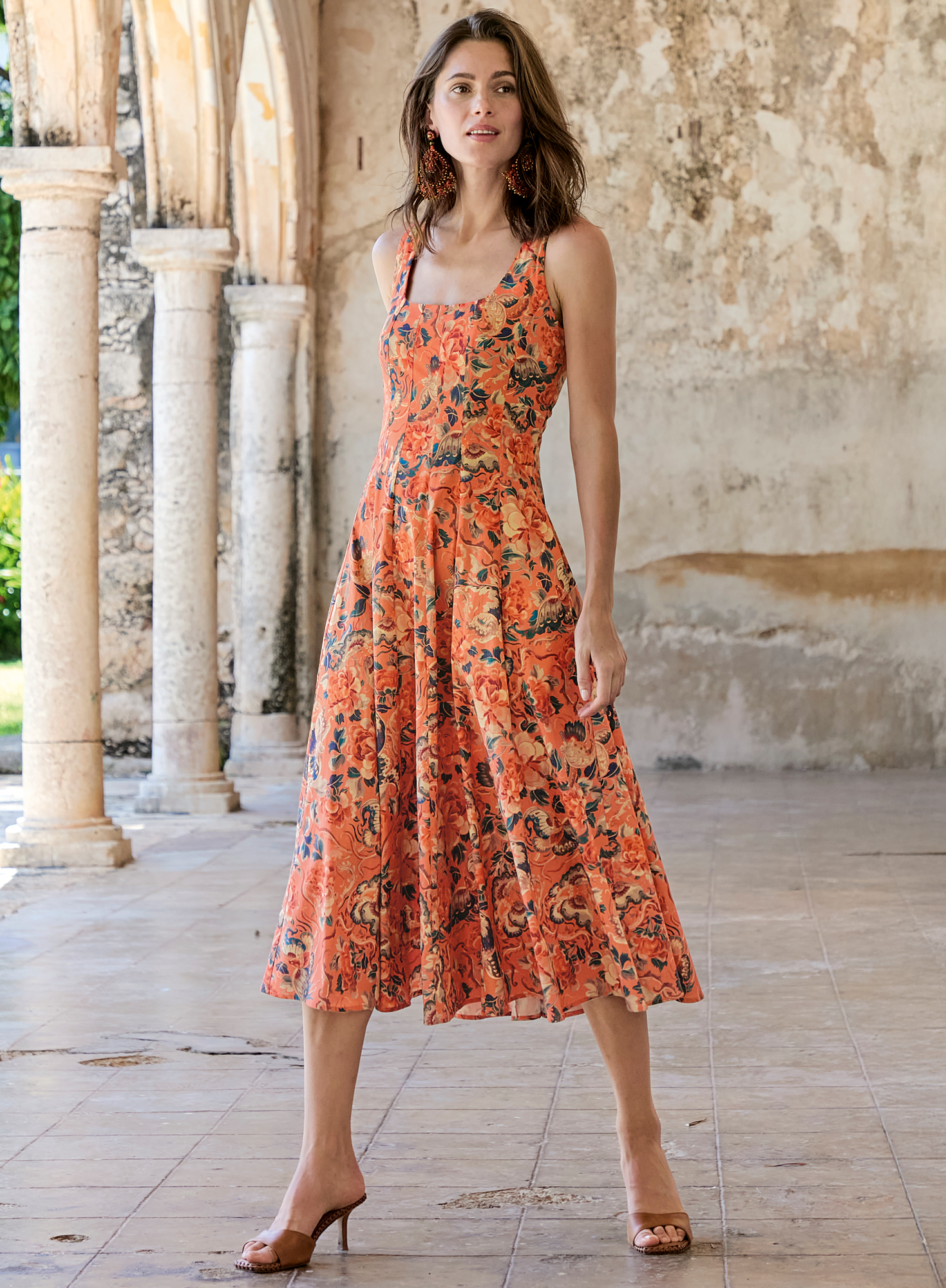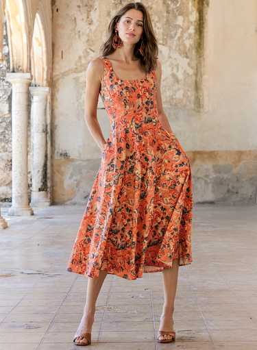 Our standout dress is a painted reinterpretation of a 19th-century Qing Dynasty medallion, showcasing delicate flowers and swirling butterflies in indigo and burgundy on a Coral ground. This cotton and elastane A-line dress features a fitted bodice detailed with princess seams, a full skirt, and a slightly square neckline; side zipper.