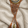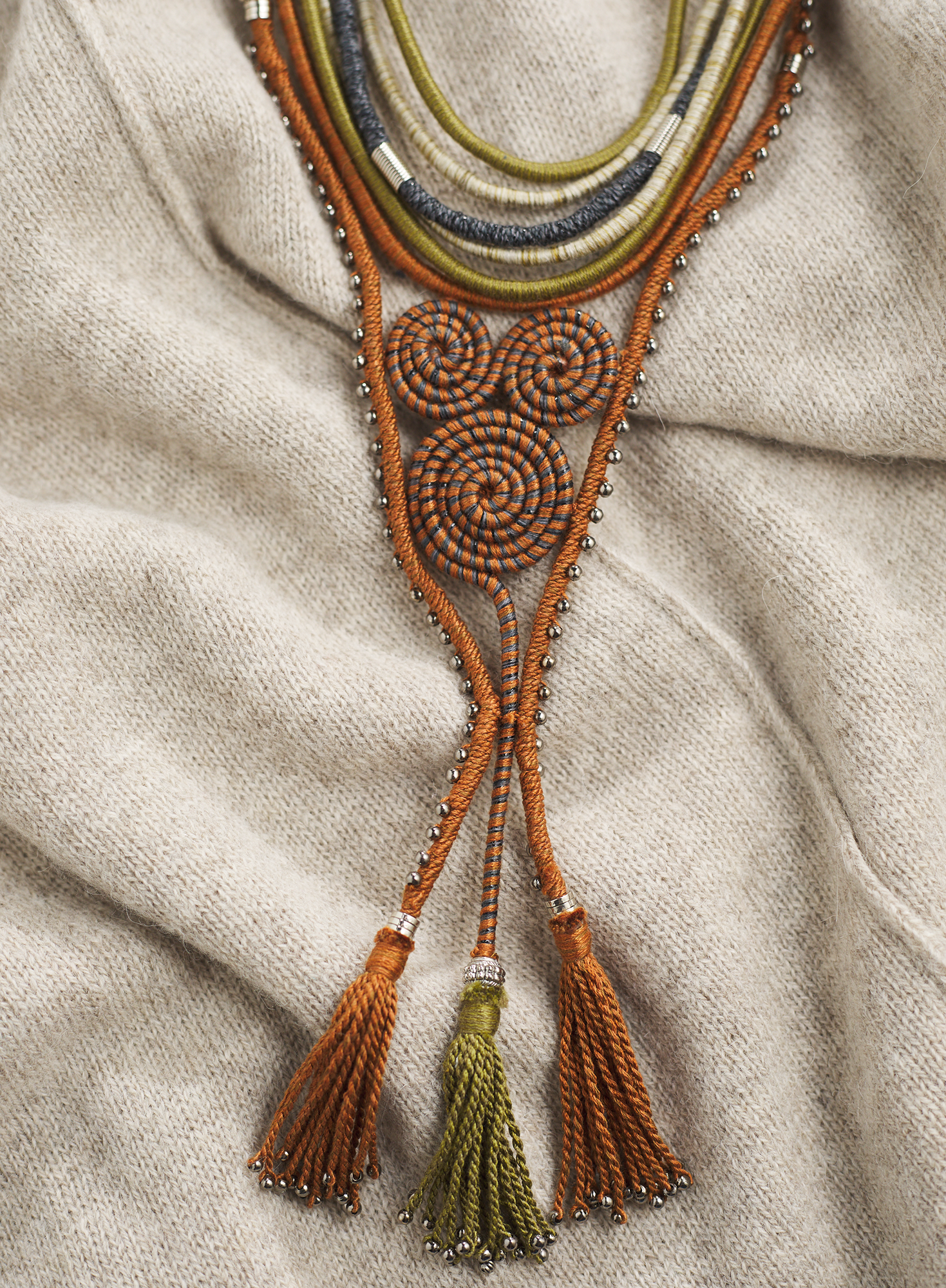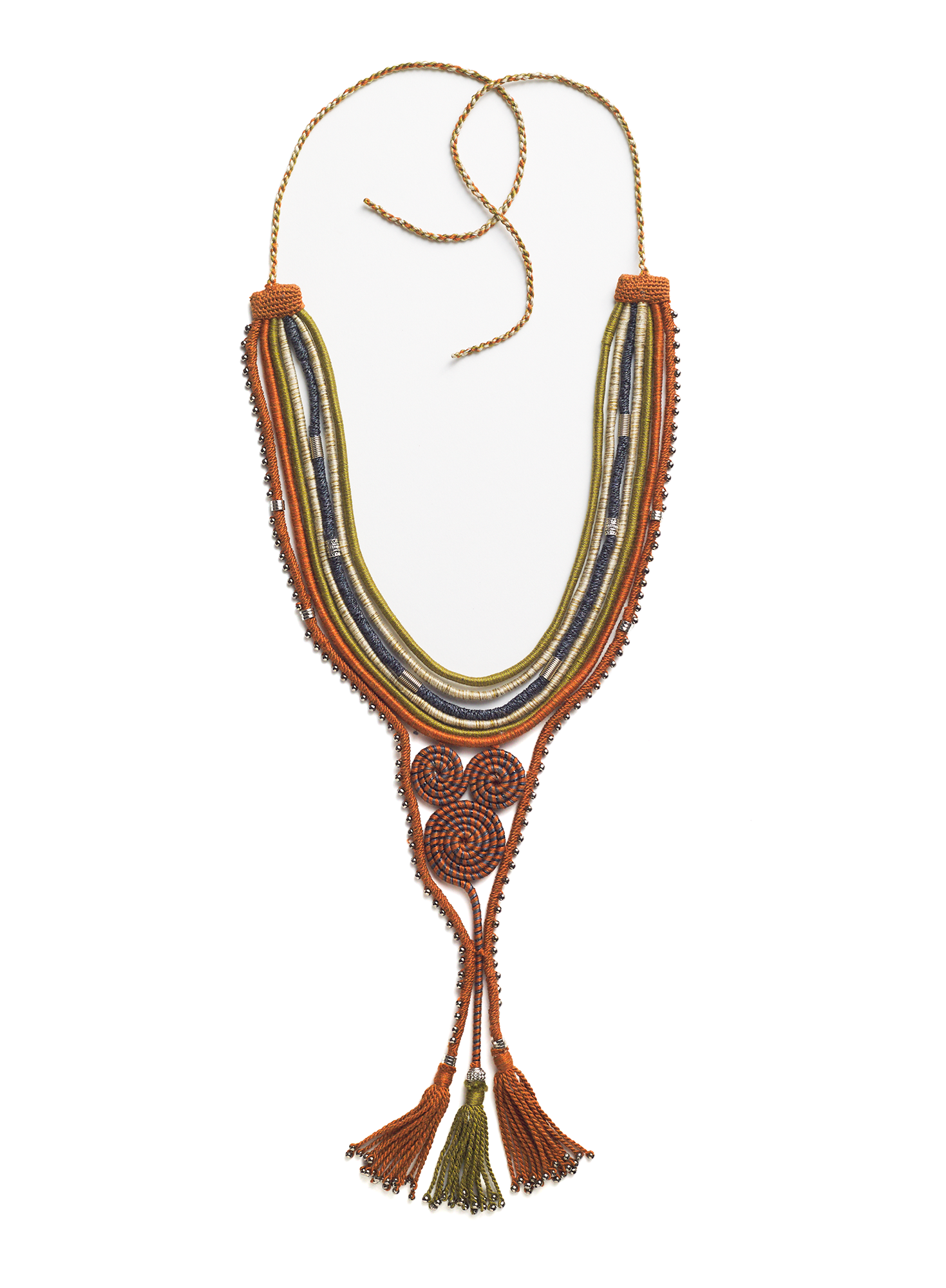This statement-making necklace is hand-wrapped and hand-crocheted of Pima cotton and metallic tweeded yarns in colors of cafe au lait, scallion, brass, putty, kumquat, black and shale. Finished with a row of metallic, bead-tipped tassels, it fastens at the back with adjustable ties. Designed and individually crafted by a group of uniquely talented Peruvian crafts people using heirloom techniques.