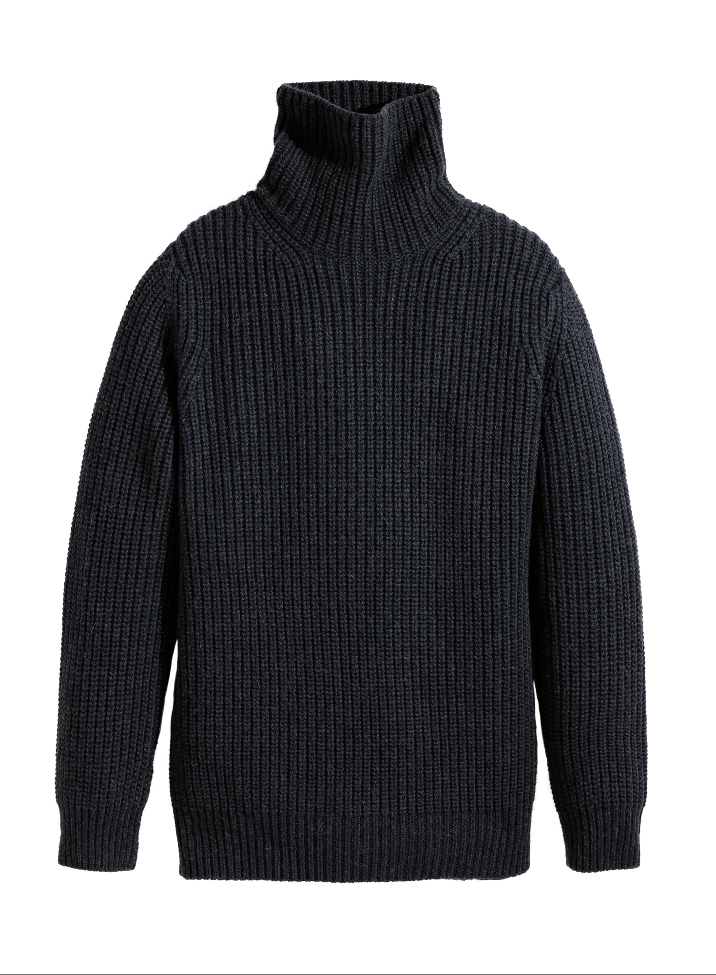 Relaxed and roomy, the pullover is full-fashion knit in ribs of thick, luxurious baby alpaca (70%) and nylon (30%). Tall turtleneck, contrast ribbed trim.