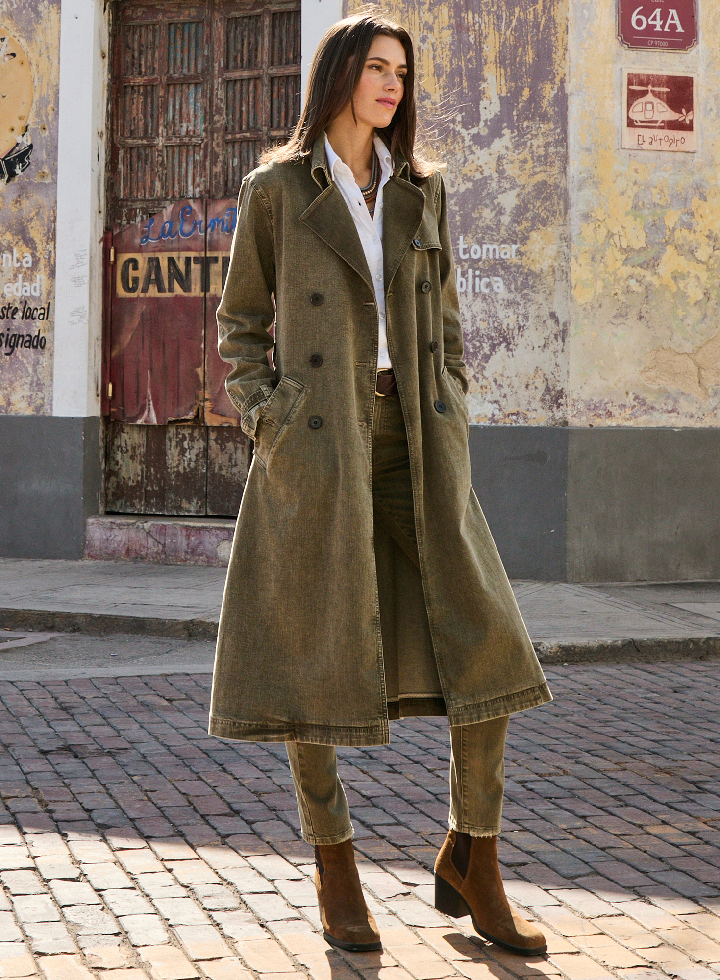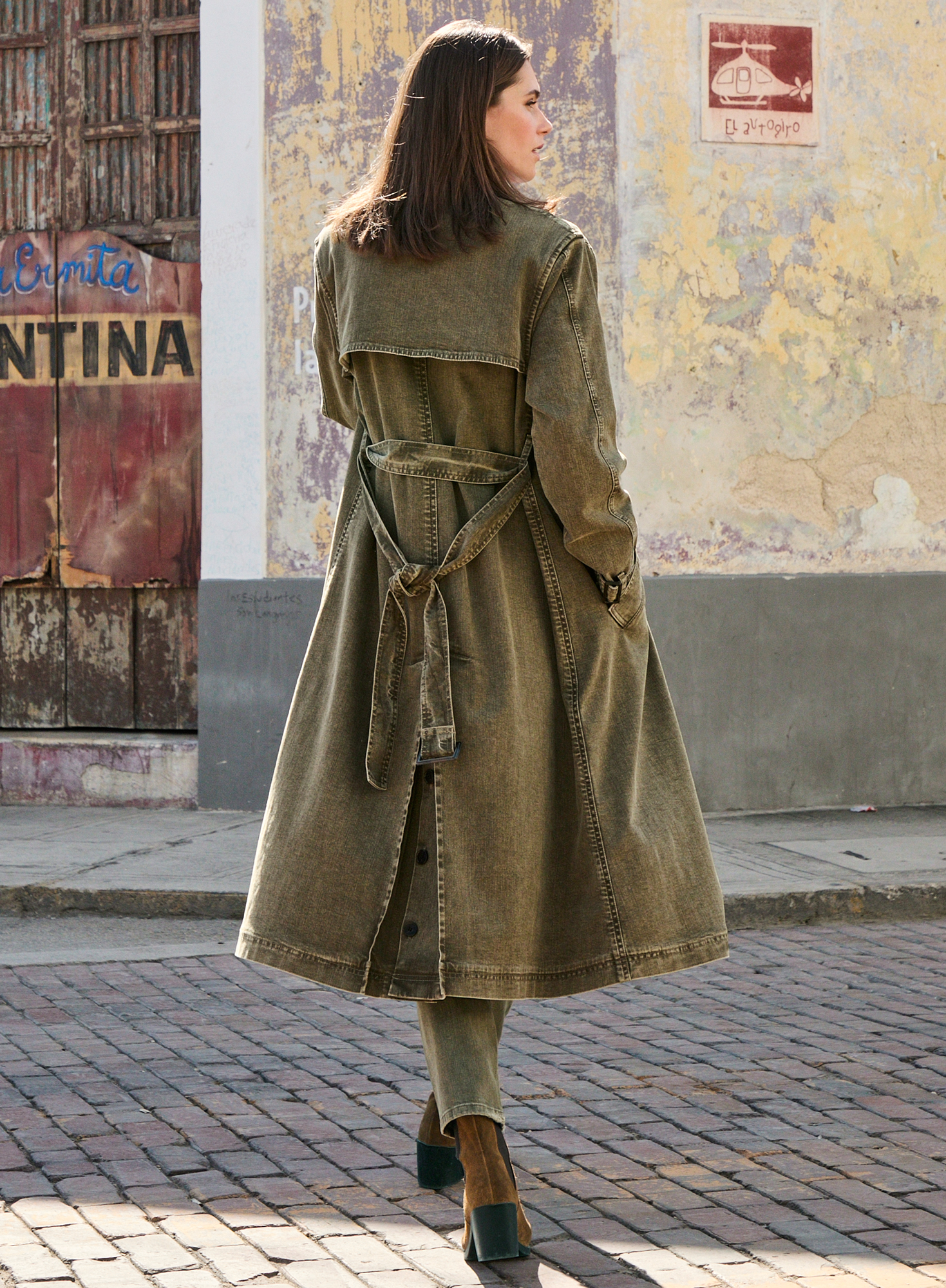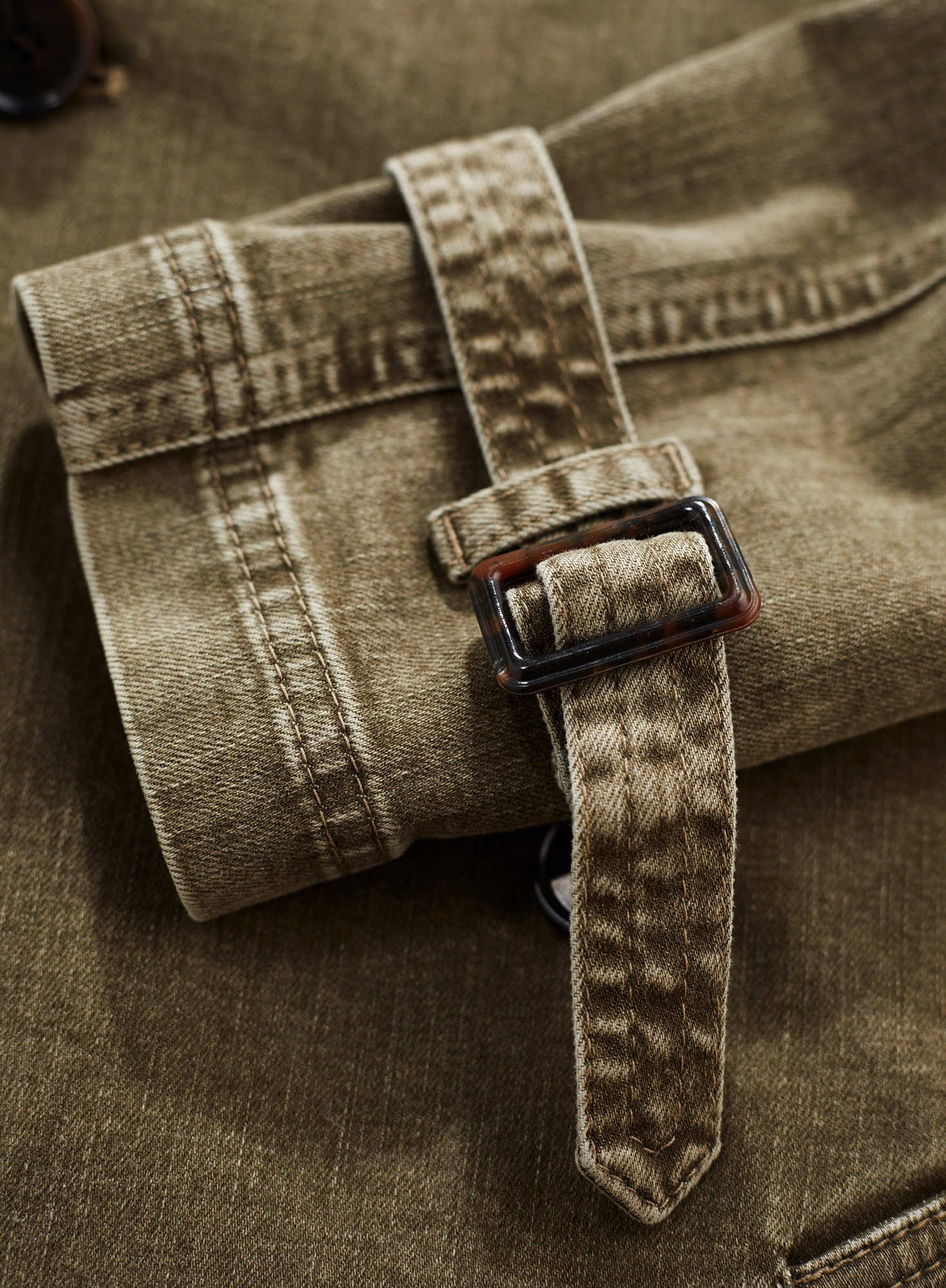 A luxe, modern iteration of an iconic wardrobe piece, our bestselling Marienbad Trench is masterfully tailored in a honeyed-olive twill cotton that’s been stone- washed for a beautifully broken-in patina. The subtle A-line silhouette is styled with traditional details: double breasted; buckling cuffs; self-belt; front and back storm flaps; wide welt pockets.