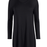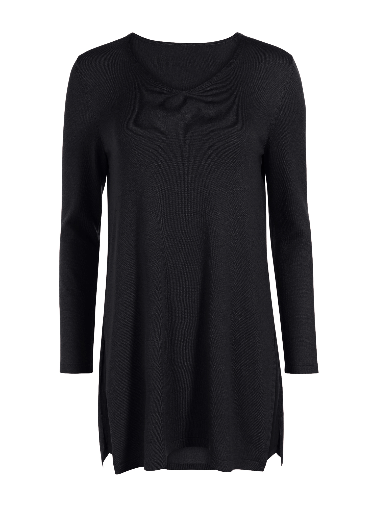 The fine gauge, full-fashion tunic strikes the perfect balance between comfort and elegance. Sewn of drapy, midnight pima (51%) and modal (49%), with a v-neck and deep side vents.