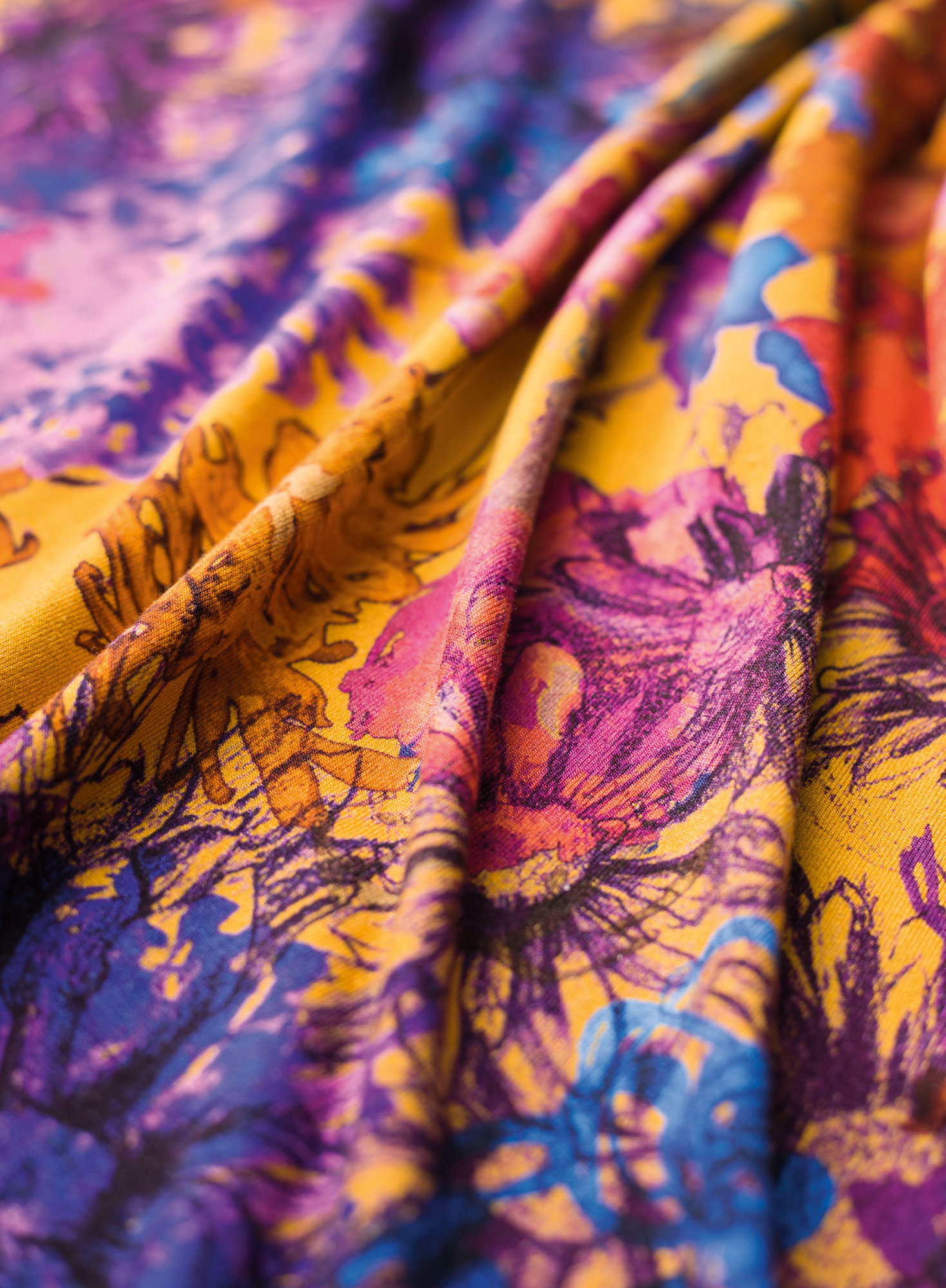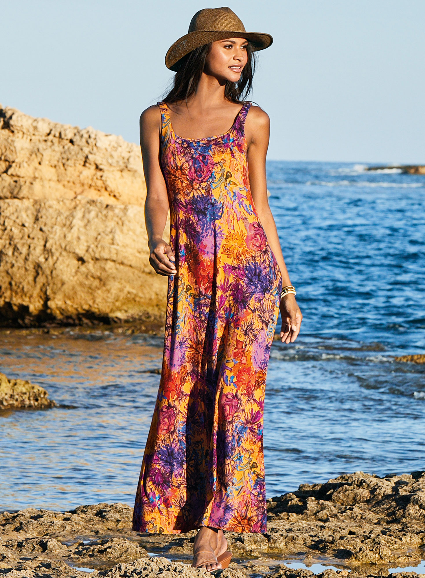 So lässig wie der Sommer: Das hübsch modellierte Maxikleid aus Viskose (95 %) und Elasthan (5 %) ziert ein Blumen- und Linien-Aquarell in Violett, Kobalt, Hot Pink und Flammenrot auf Bernstein. Am Oberteil eng anliegend und zu einem knöchellangen Saum ausgestellt; Halbschalen-BH.