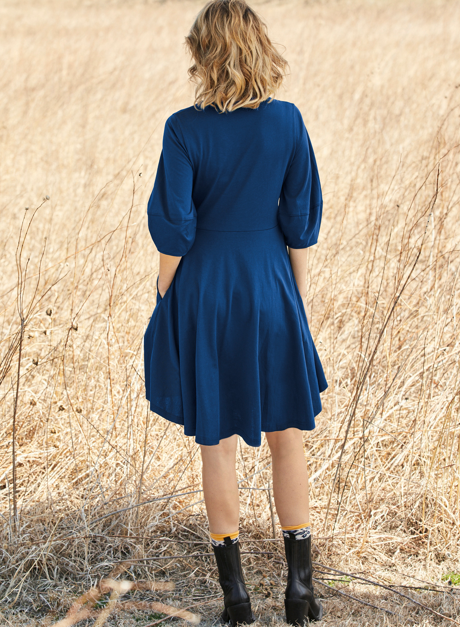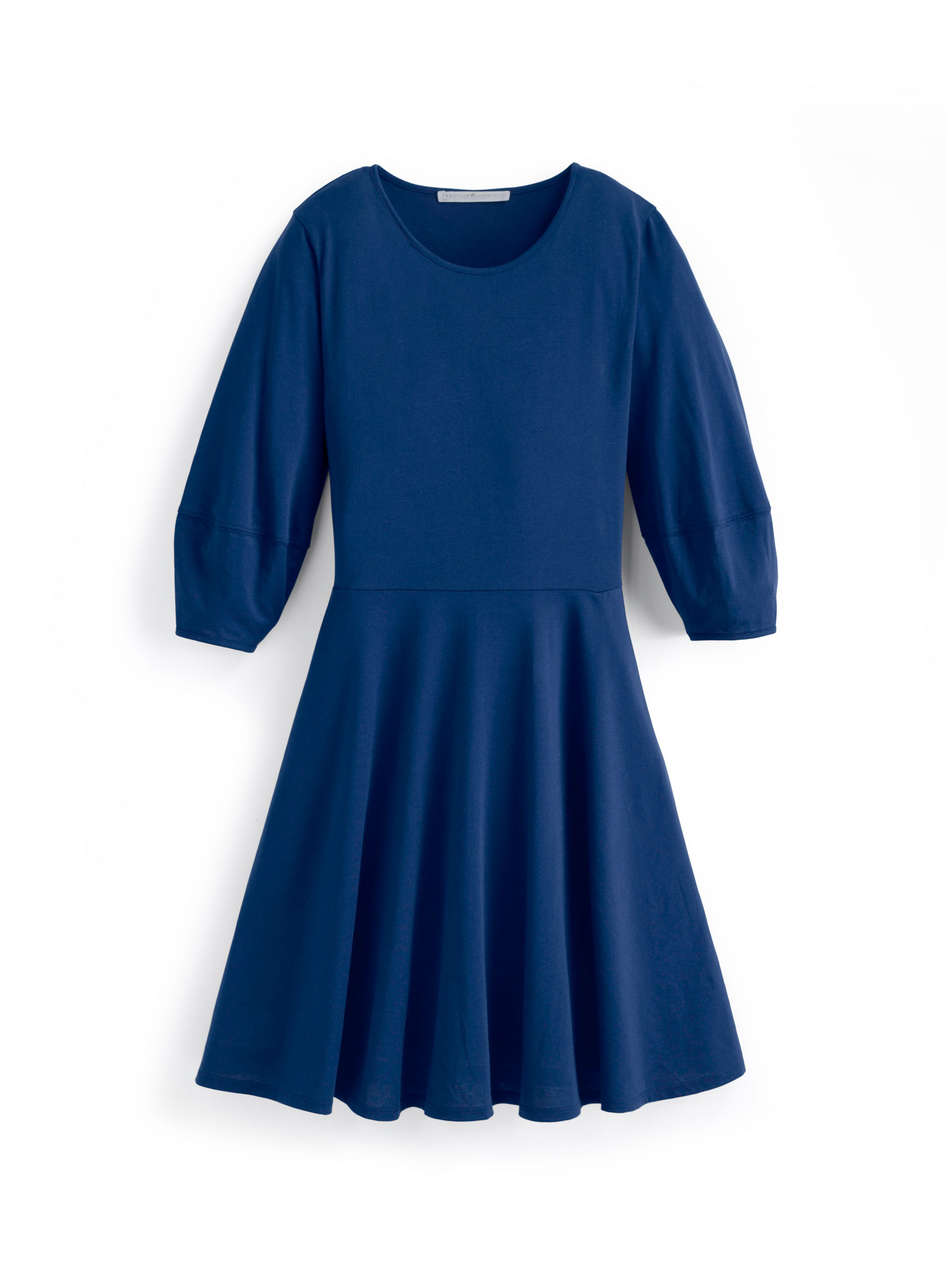 Unser reizendes saphirblaues Kleid aus Pimabaumwoll-Jersey hat bauschige, lampionförmige Ärmel. Perfekt für Sommer bis Herbst, mit Taillennaht, Taschen und schwungvollem Saum.