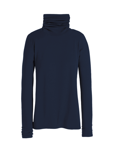 Unser beliebter elastischer Pullover aus Pimabaumwolljersey (96 %) mit Lycra (4 %) hat einen knautschbaren Rollkragen und liegt eng an.