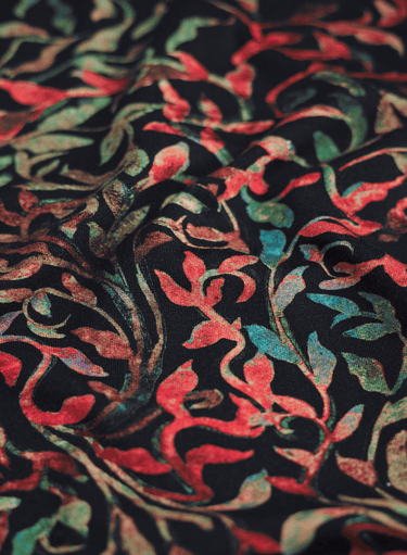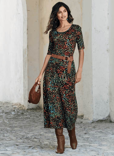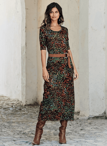 Einfach überstreifen: Das Kleid ist aus luxuriösem Pimabaumwoll-Jersey gefertigt; etwas Elasthan verleiht einen perfekten Sitz. Beliebte Silhouette mit Rundhalsausschnitt, leichtem A-Linien-Saum und halblangen Ärmeln. Mit unserem exklusiven Print nach handgemalten Aquarell-Blumenranken in Schokolade, Rost, Smaragd und Türkis auf schwarzem Grund.