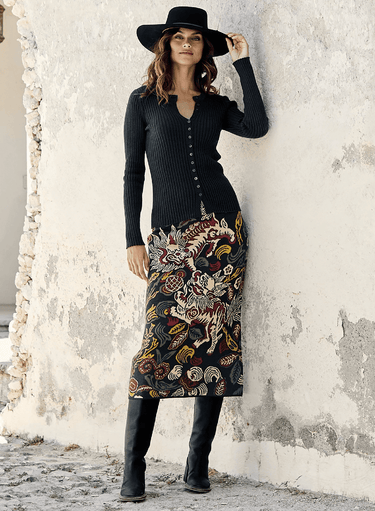 Entdecken Sie die Schönheit indonesischer Handwerkskunst in unserem jacquardgestrickten Rock aus Pimabaumwolle. Elastikbund und leichte A-Linien-Silhouette verleihen eine bequeme und schmeichelhafte Passform. Das wirbelnde Muster – inspiriert von einem Batik-Print auf einem Sarong aus Java – zeigt einen botanischen Garten mit zwei majestätischen Wächterlöwen in Bernstein, Oliv, Ingwer und Sand auf nachtblau-meliertem Grund.