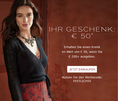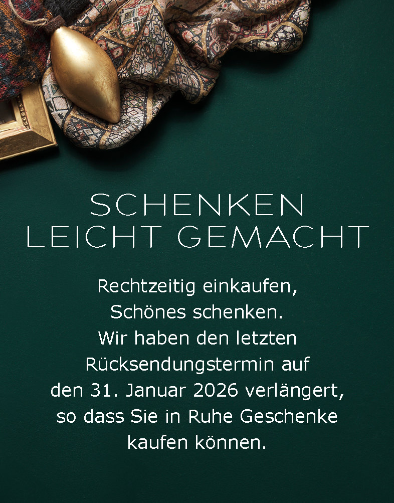 Ihr Geschenk im Wert von € 50 bei Ihrem nächsten Einkauf: Um Ihr Geschenk im Wert von € 50 bei Ihrem nächsten Einkauf zu erhalten, müssen Sie fürmindestens € 200 (ausschließlich Versandkosten) einkaufen und den Code FESTLICH50 während des Zahlungsprozesses eingeben. Gültig nur für neue Bestellungen, solange der Vorrat reicht. Dieses Angebot kann nicht mit anderen Angeboten kombiniert werden und gilt nicht für frühere Käufe oder Umtauschaufträge. Nur einmal pro Kunde/Kundin nutzbar. Dieses Angebot gilt von Freitag, d. 31. Oktober, 0.00 Uhr MEZ, bis Freitag, d. 14. November 2025, 23.59 Uhr MEZ. Ihr Geschenk im Wert von € 50 wird Ihnen bis Montag, d. 17. November, per E-Mail geschickt. Wenn der ursprüngliche Kauf storniert oder die Ware zurückgesandt wird, erhalten Sie das €50-Geschenk nicht oder das Geschenk wird nach Erhalt ungültig.