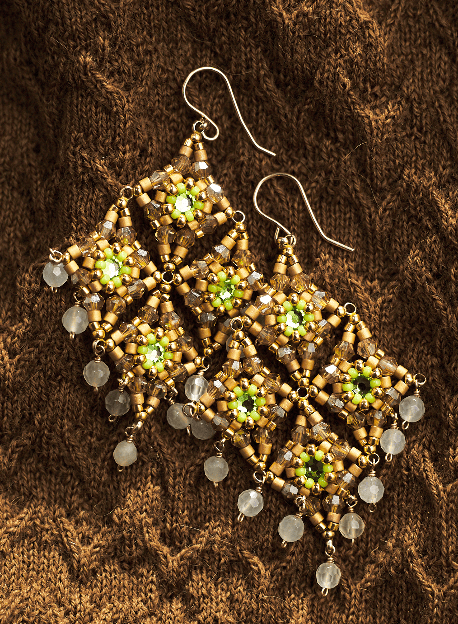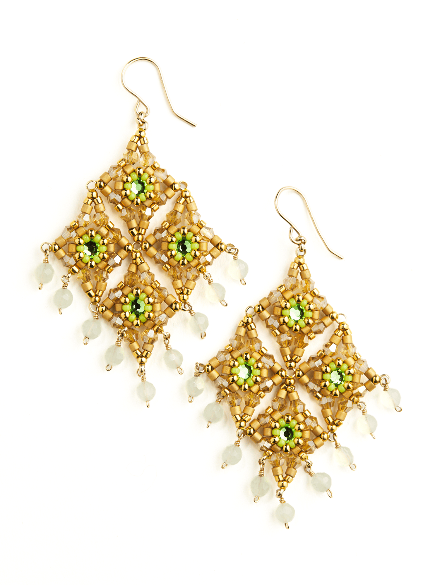 Unsere rhombenförmigen vergoldeten (14 kt) Ohrringe mit Kristallen und Miyuki-Perlen verleihen jedem Look eine Extraportion Glamour.