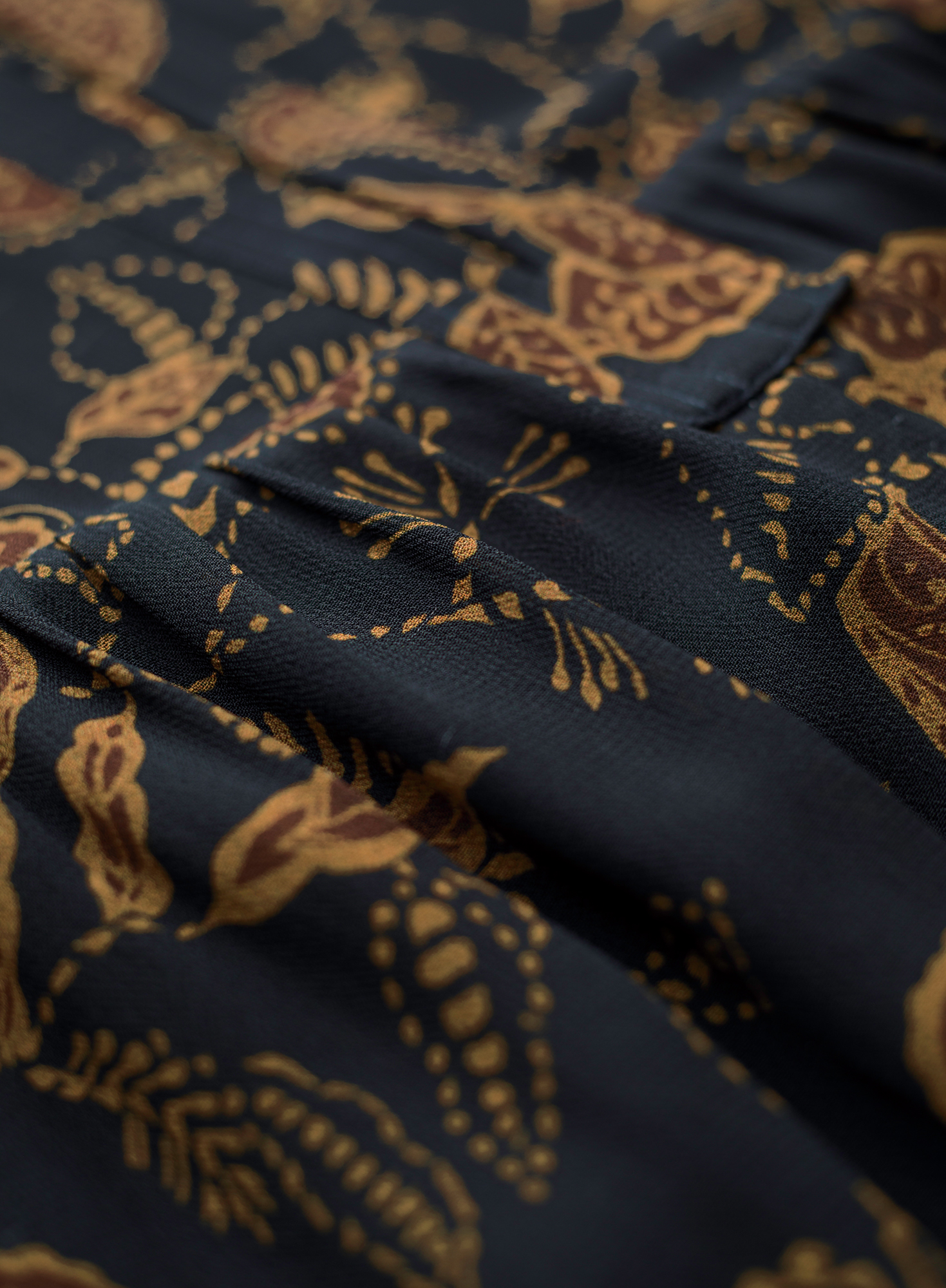 Aus fließender, gewebter Viskose genäht und schick vollendet mit gerüschtem Kragen, geschlitztem V-Ausschnitt, Puffschultern und einer hochgerückten Taillennaht, die sich zu einem schwungvollen Saum weitet; Taschen; gefütterter Rock.