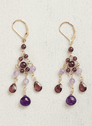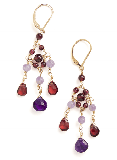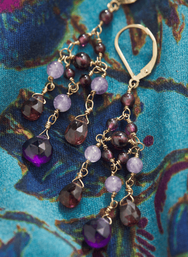 Bunte Amethyst- und Granatperlen baumeln anmutig an Drahthäkchen. Leicht und vielfältig kombinierbar – von morgens bis in die Nacht passend.