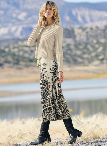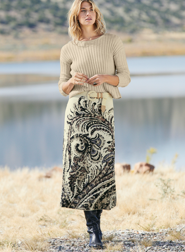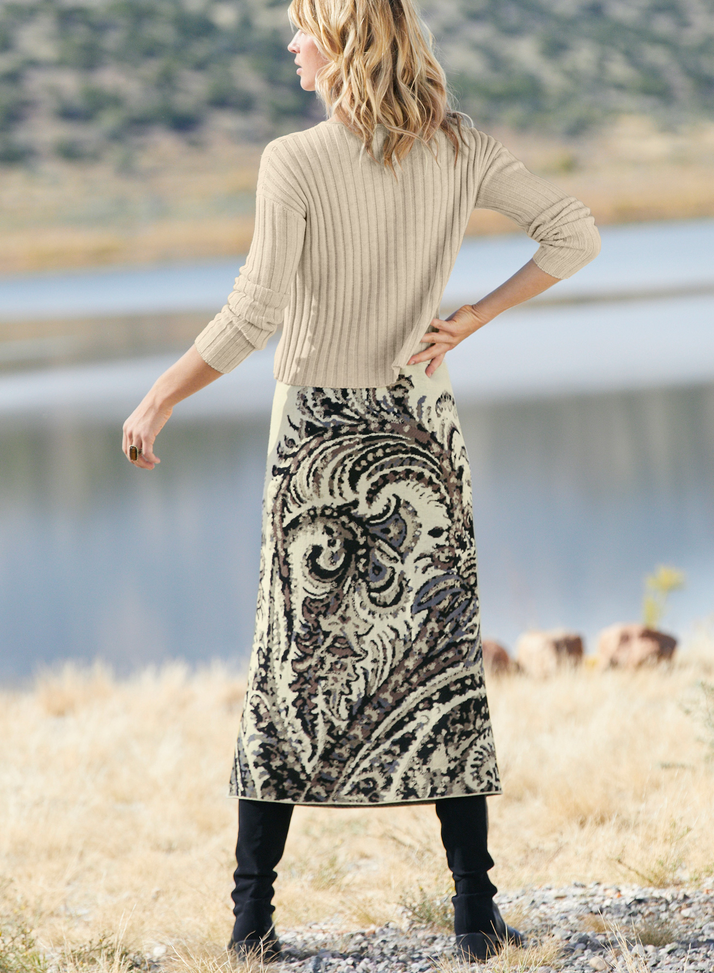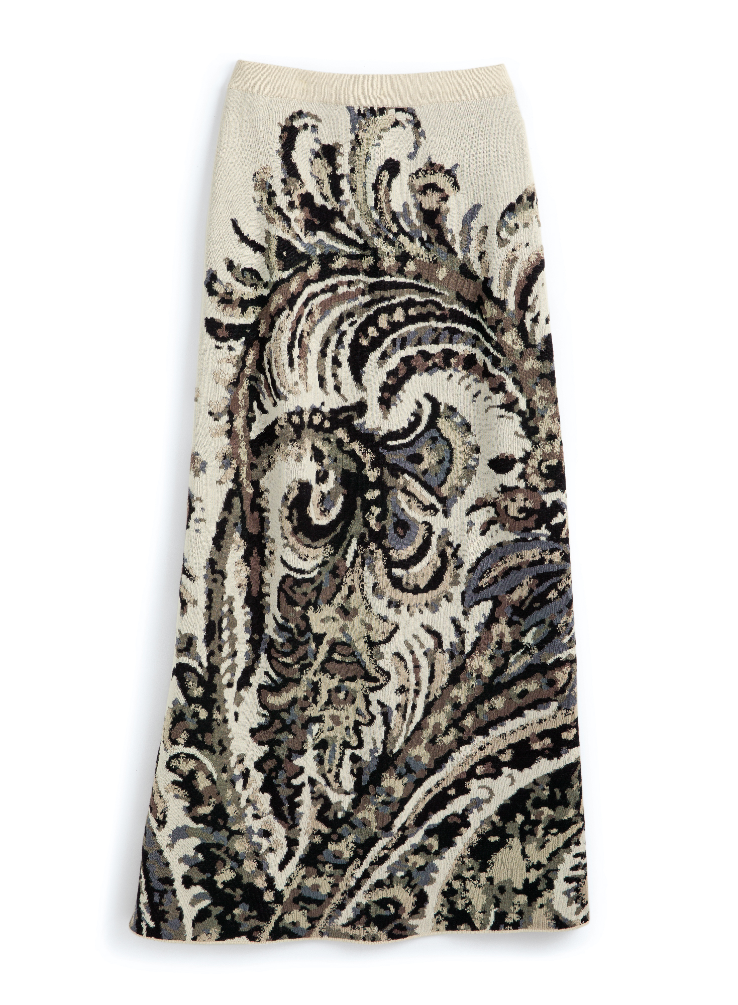 Den Jacquardstrick-Midirock aus Pimabaumwolle zieren übergroße Paisleys in Schwarz, Grau, Sand und Crème, die an brechende Wellen erinnern.