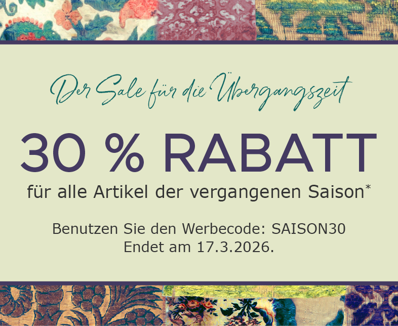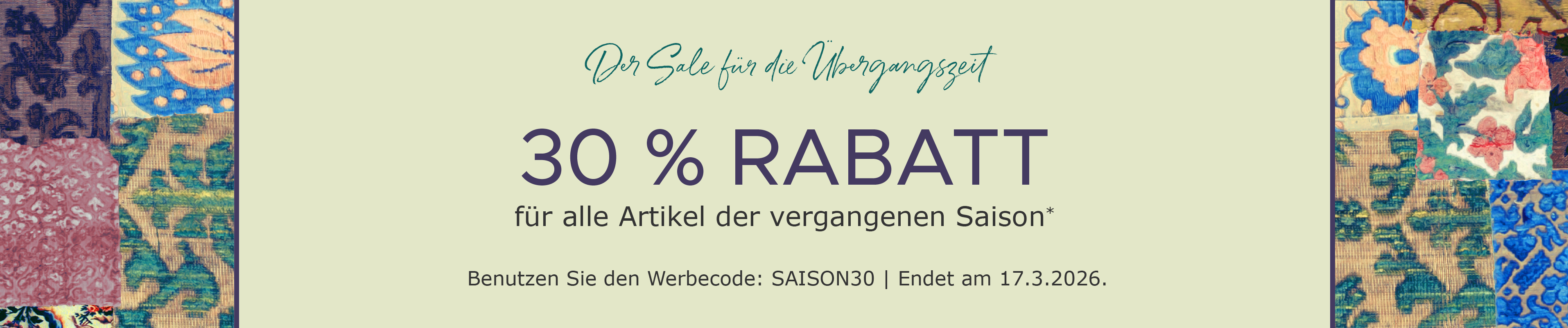 *30 % Rabatt bei vorrätigen, besonders gekennzeichneten Artikeln: Dieses Angebot gilt für neue Bestellungen, und nur solche, die auf unserer Webseite Außerordentliche Sparaktion (Special Savings Event) zu finden sind, oder suchen Sie nach dem Kennzeichen für den 30%-Rabatt. Auf keinen anderen Artikel kann unser Angebot eines Rabatts von 30 % angewendet werden. Dieses Angebot kann nicht mit anderen Angeboten kombiniert werden und gilt nicht für frühere Käufe oder Umtauschaufträge. Der Rabatt kann nicht für den Kauf von Geschenkgutscheinen, für neueste Artikel und für nachbestellte Artikel angewendet werden. Der Rabatt wird im Warenkorb oder während des Zahlungsvorgangs verrechnet, wenn Sie dabei den Code SAISON30 eingeben. Das Angebot gilt ab Donnerstag, d. 12. März 2026, 0.00 Uhr, bis Dienstag, d. 17. März 2026, 23.59 Uhr.