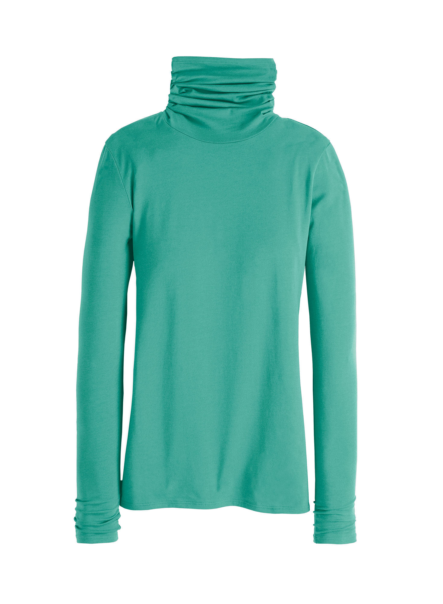 Unser beliebter elastischer Pullover aus Pimabaumwolljersey (96 %) mit Lycra (4 %) hat einen knautschbaren Rollkragen und liegt eng an.