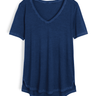 Das unentbehrliche Pimabaumwoll-T-Shirt hat einen tiefen V-Ausschnitt, einen gerundeten, hinten länger fallenden Saum und Seitenschlitze. Im Bund oder lose darüber zu tragen. Mit schöner Vintage-Patina stückgefärbt.
