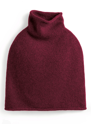 Üppiges Alpaka (93 %) und Polyamid (7 %) sind zu einer kuscheligen Lage verstrickt und dann gefilzt. Knautsch-Stehkragen, Rollkanten. Die passenden fingerlosen Handschuhe und die Mütze vervollständigen das winterliche Ensemble.