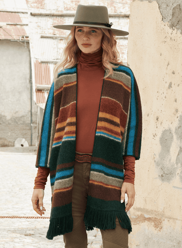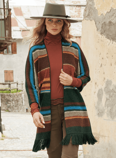 A sensational show-stopper, our boiled knit cardigan pays tribute to traditional Peruvian artisan textiles. Superbly crafted of brushed baby alpaca, the oversized silhouette is knit with classic blanket stripes and Andean manta motifs in bold, brilliant hues with hand-tied fringe at hem. Styled with a V-neck and 3/4 sleeves.