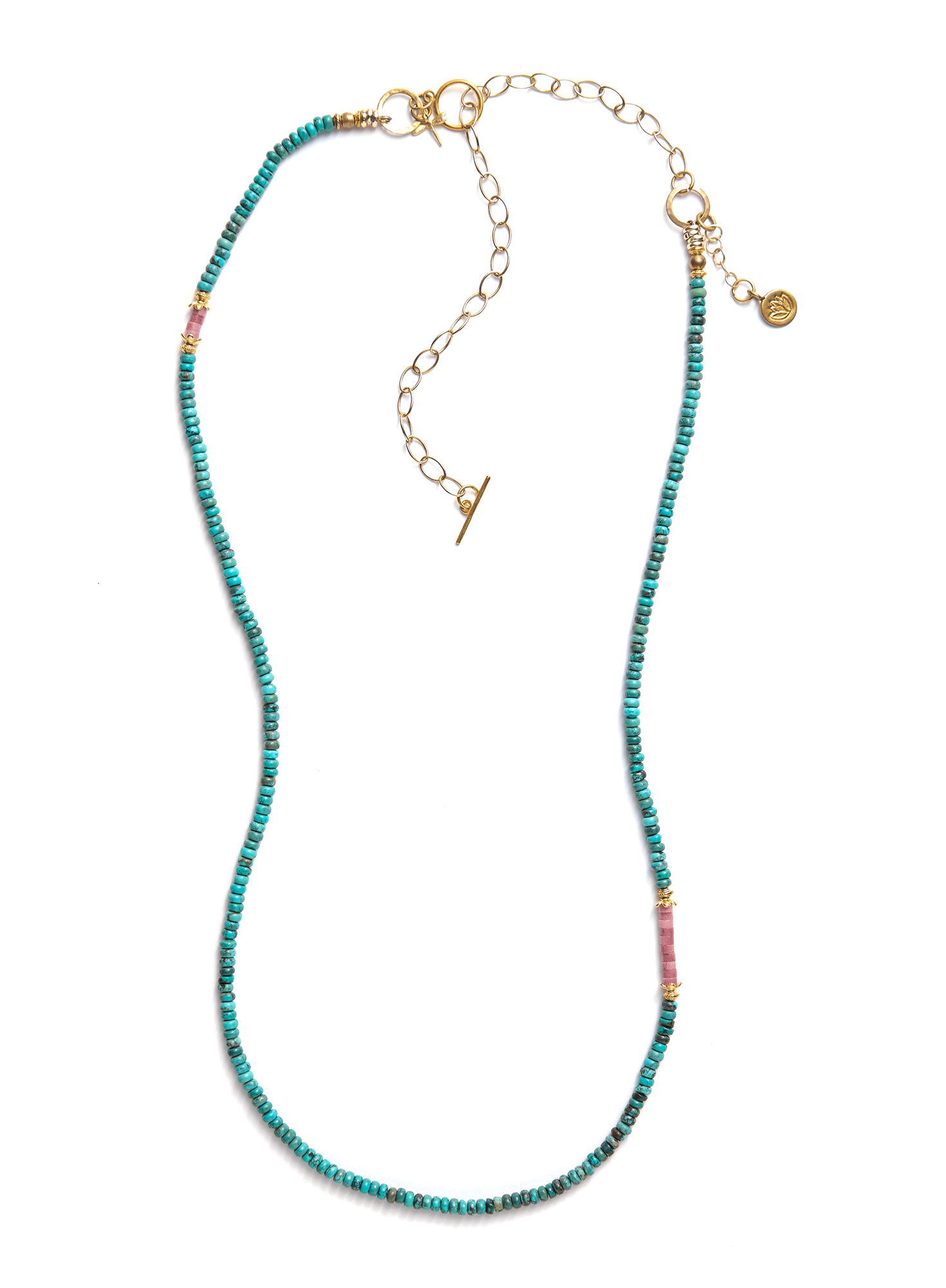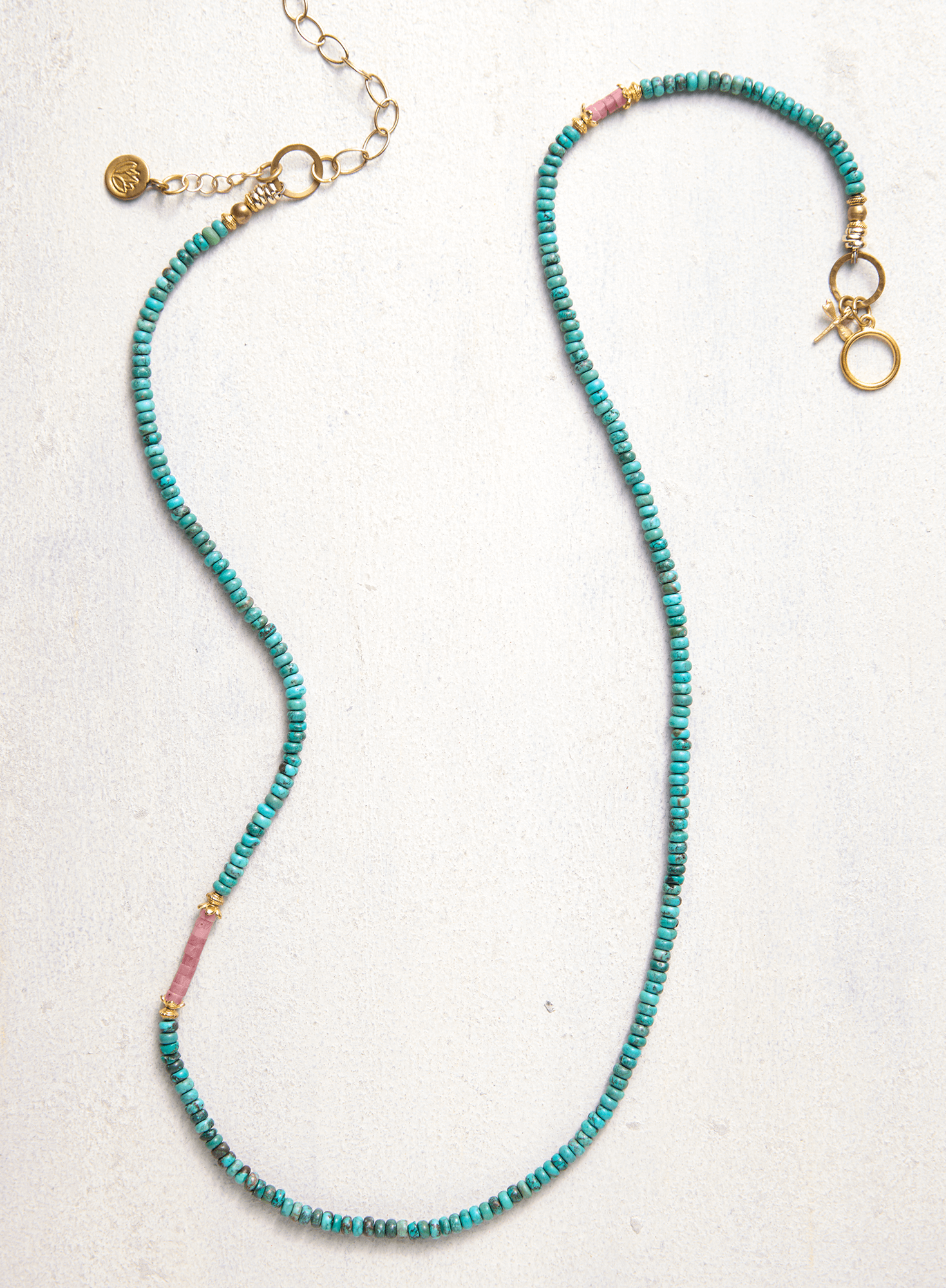 Designed to be worn as a long, single strand or doubled up, our Playa necklace is strung with brilliant African turquoise stones punctuated with pretty pink rhodonite for a look that’s bright and summery. Accented with shimmery brass links and a toggle clasp with tiny charms; adjustable.