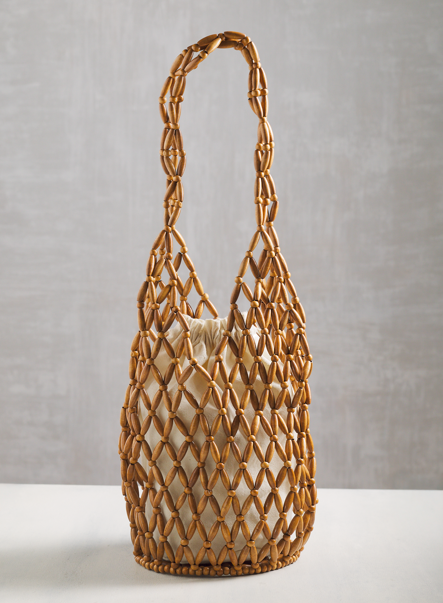 Chic, hand-strung wooden beads in a sculpted bucket silhouette bring energy to everyday style. Inspired by vintage, handmade beadwork totes, with a cotton lining and drawstring closure.
