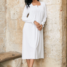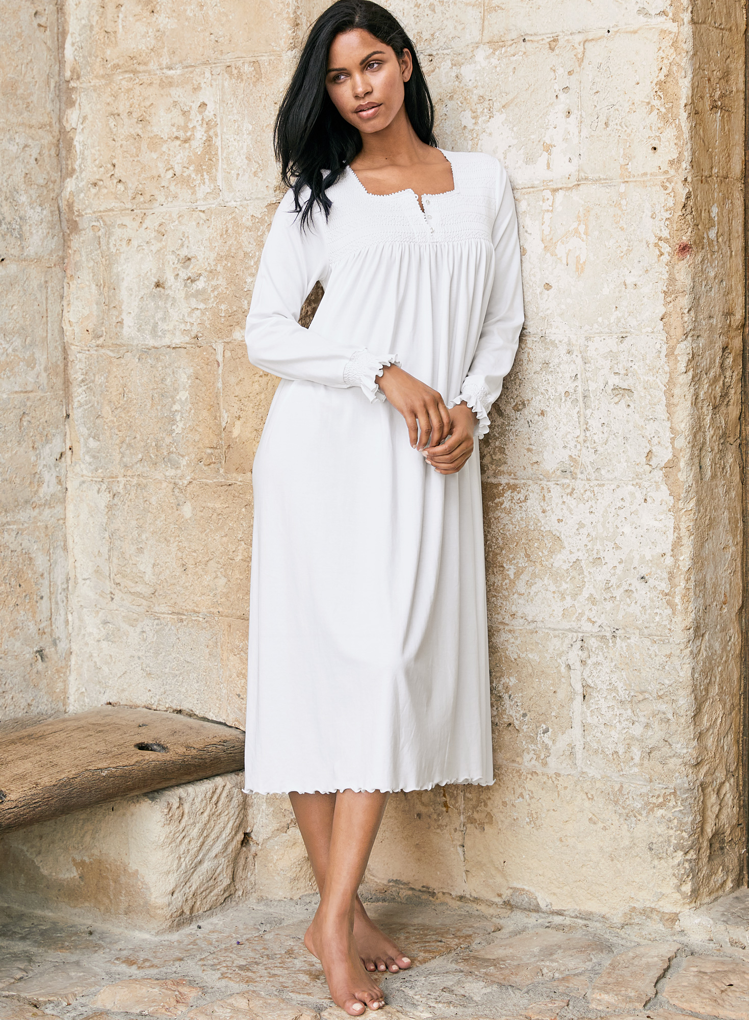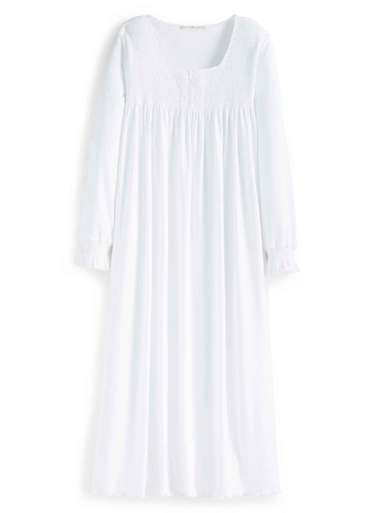 Delicate smocking garnishes the yoke and cuffs of this cloud-soft pima jersey gown. Beautifully finished with handcrocheted detailing at the square neckline; lettuce-edged trim.