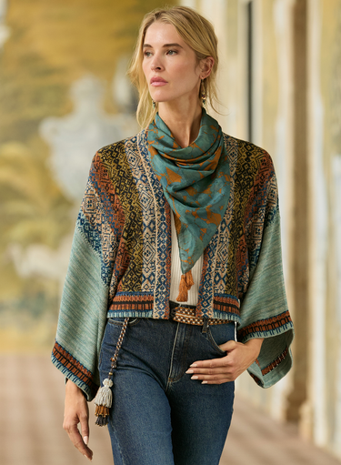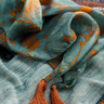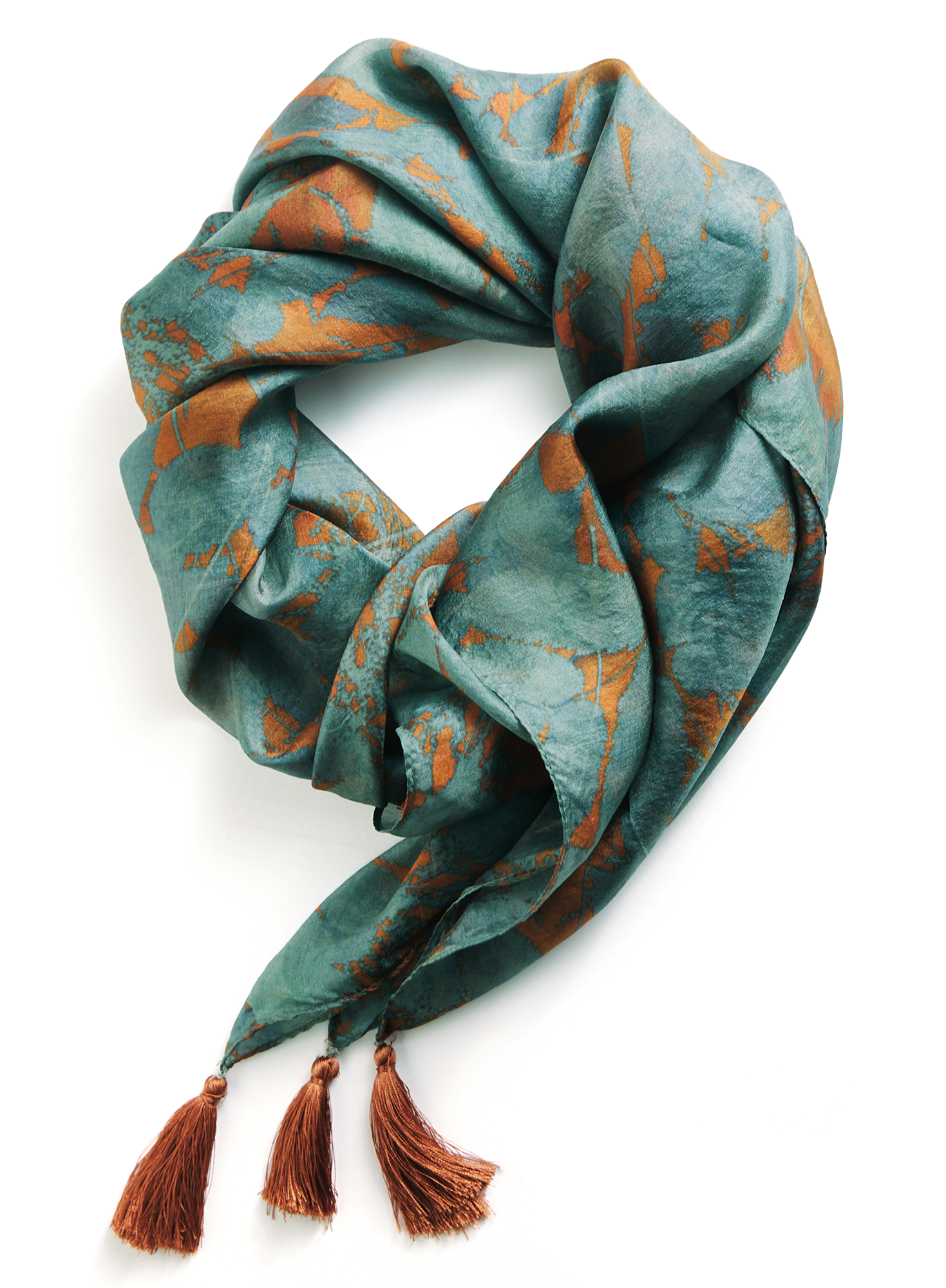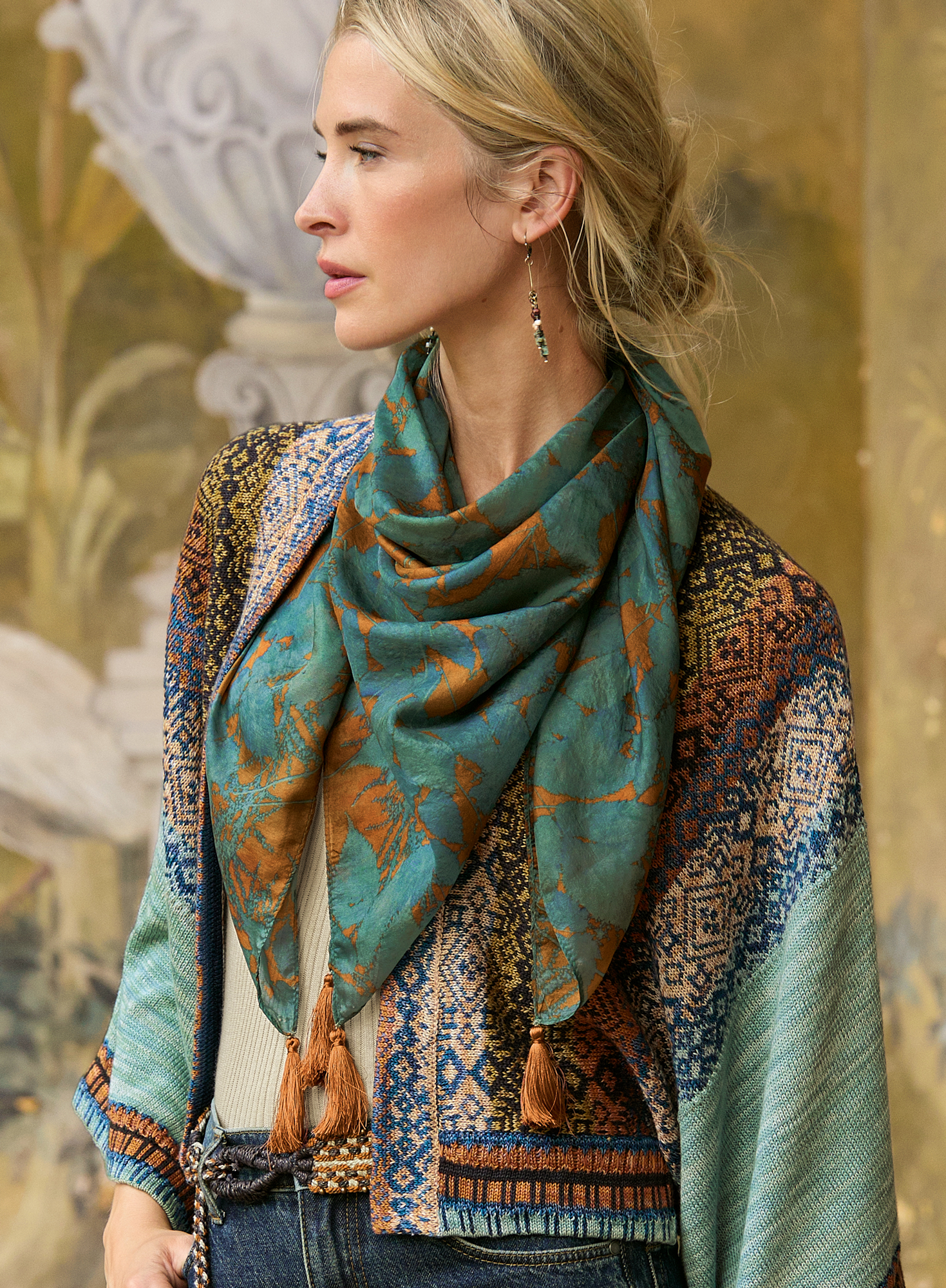 This elegant silk, square scarf showcases a beautiful painterly leaf print in rust and orange on a patinaed turquoise ground. Tassels in each corner add a touch of sophistication to any outfit.