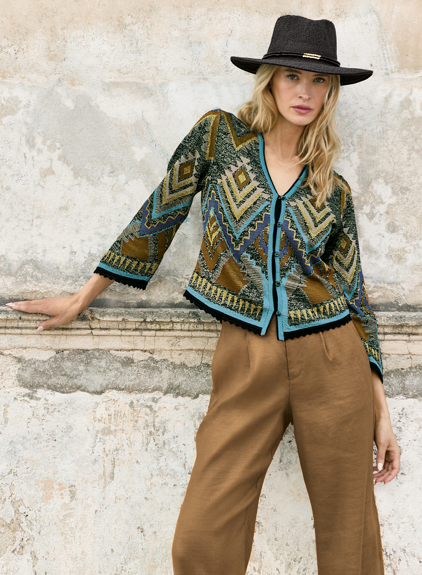 Our head-turning, artisan-designed, Pima cotton jacket showcases a textural jacquard mix of Peruvian geometrics in twilight shades of ultramarine, maple and black blended with black and gold metallic threads. Belled sleeves; crochet trim; contrast patterning at V-neck and buttoning placket; angled slit at back hemline.