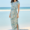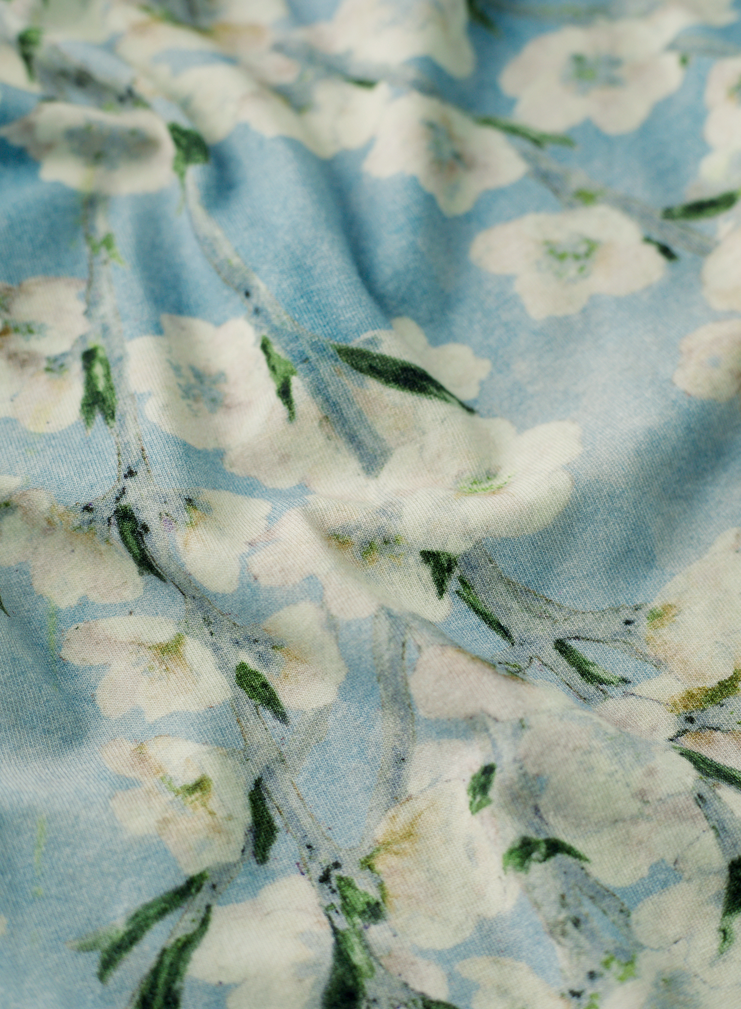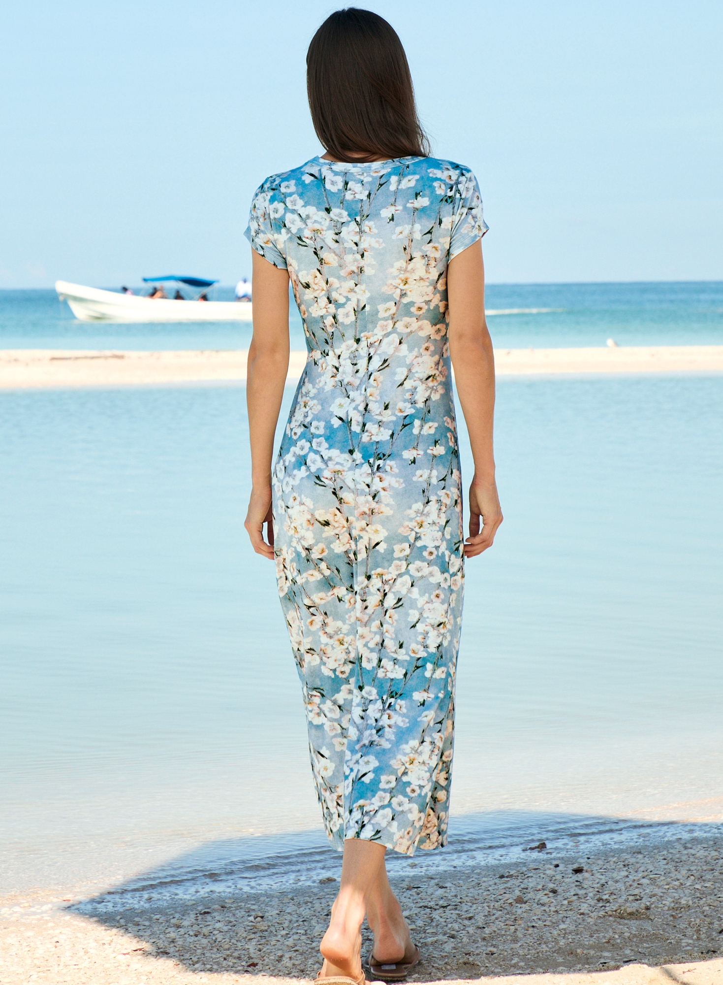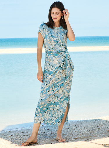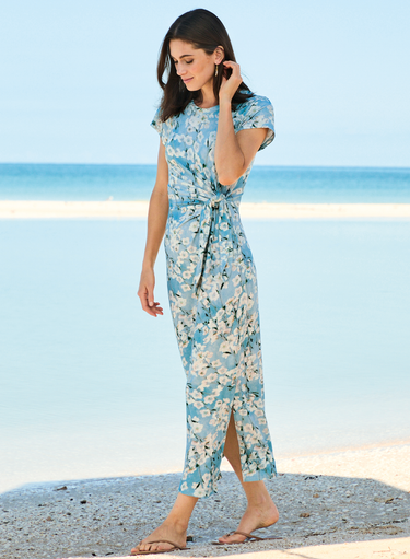 White watercolor blossoms grounded in painterly Sky Blue float across our shapely T-shirt dress. The perfect all-occasion dress for summer travels, in packable Pima cotton, modal and spandex jersey, with a flattering, faux-wrap waist tie, back seam and side slits; crewneck.