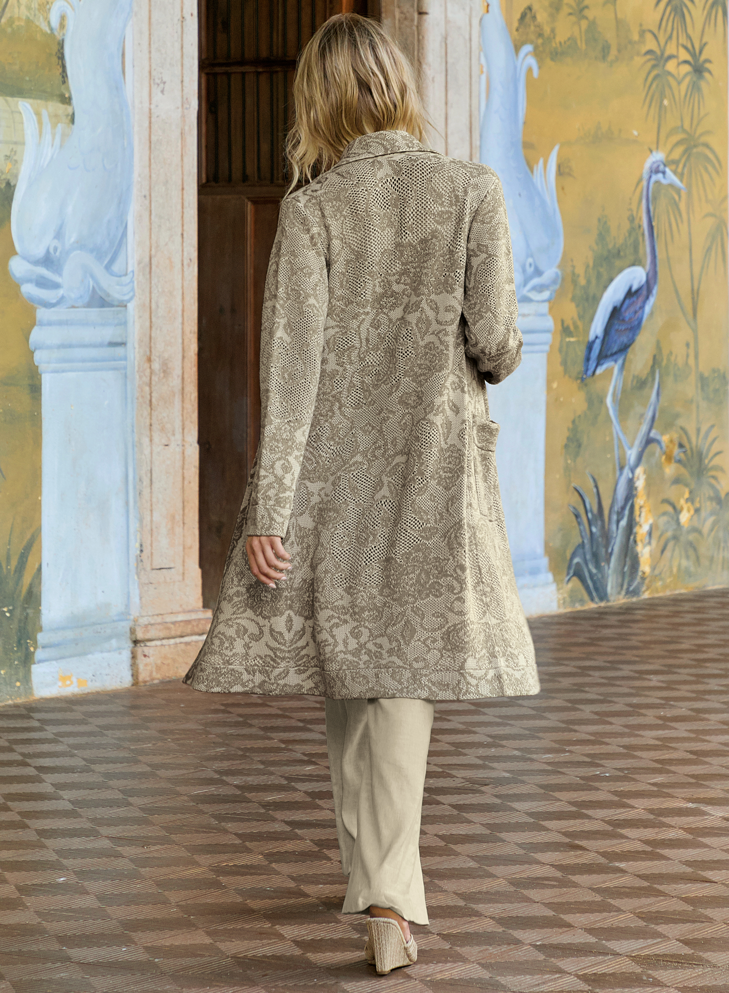 Elegance in every detail. This long-sleeve, Pima cotton coat is crafted from textured jacquard pointelle and delicate floral lace patterns in soft neutral tones. With a tailored lapel, patch pockets and button-front closure, it’s designed for timeless sophistication. Engineered with precision, the set-in shoulders and refined construction offer a chic silhouette for the woman who values unique, enduring knitwear.