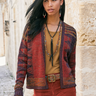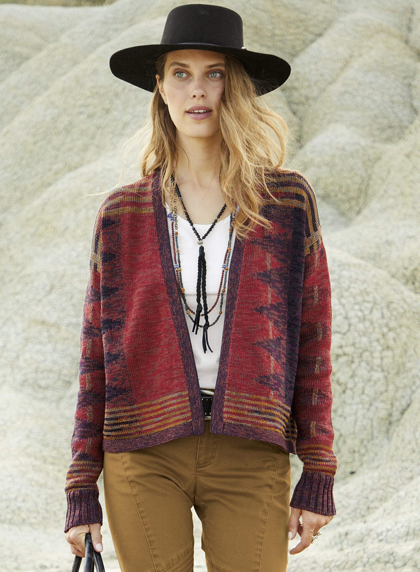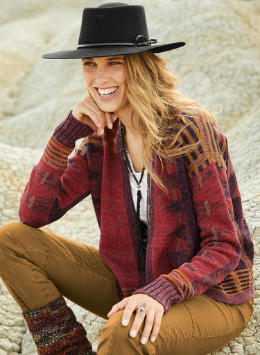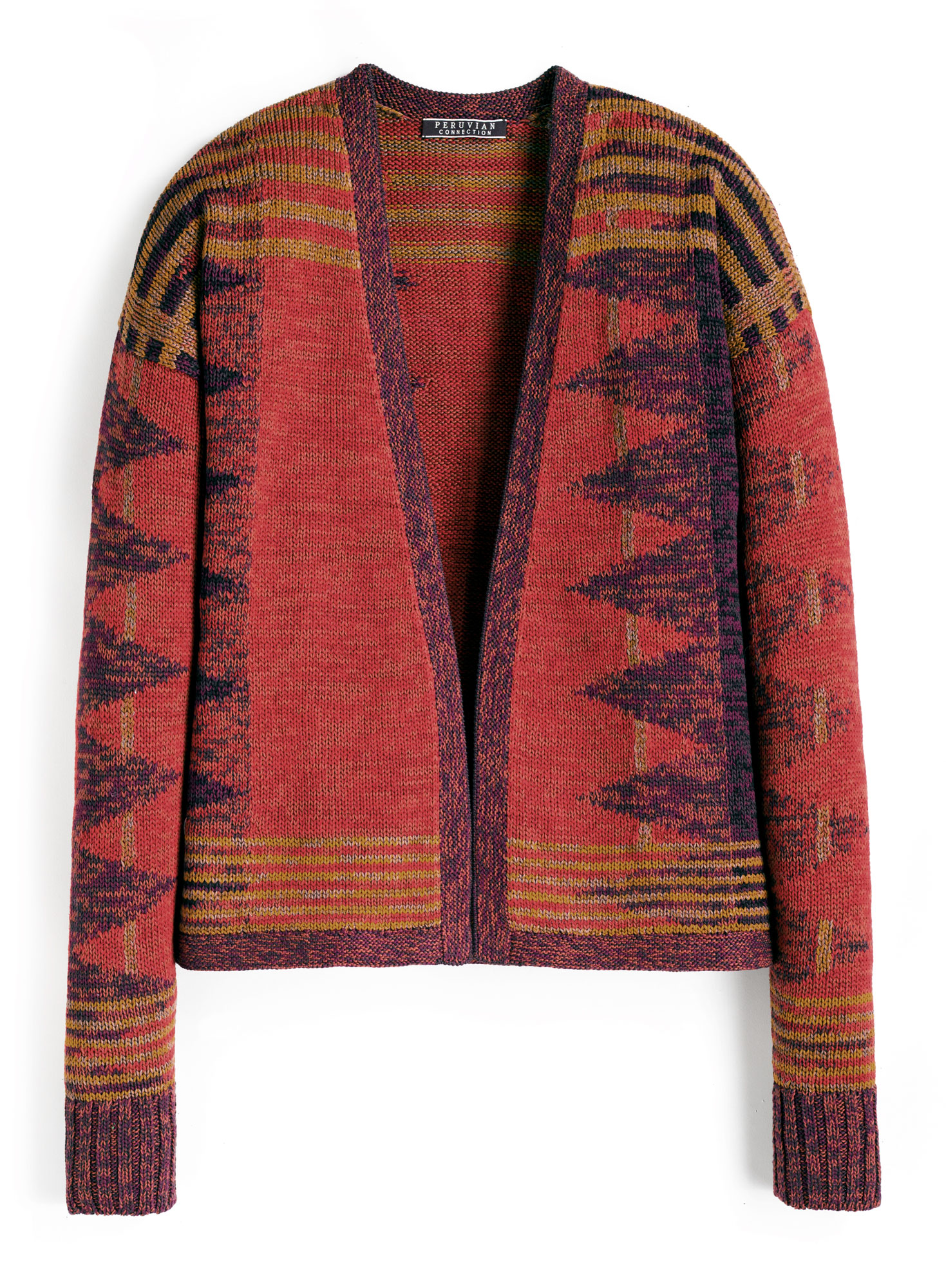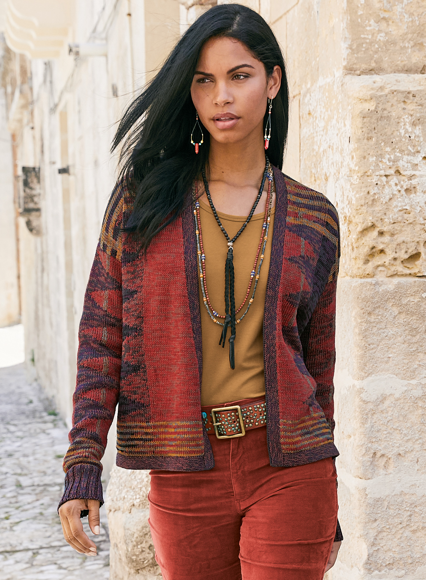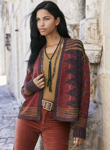 A textile from Egypt’s Nile Valley inspired the gorgeous patterning of this gallery-worthy art knit. Masterfully intarsia handknit of tweeded, mercerized pima in a warm, spicy palette of crimson, brass, plum and black, with drop shoulders, an overlapping buttonless closure, ribbed cuffs and contrast trim.