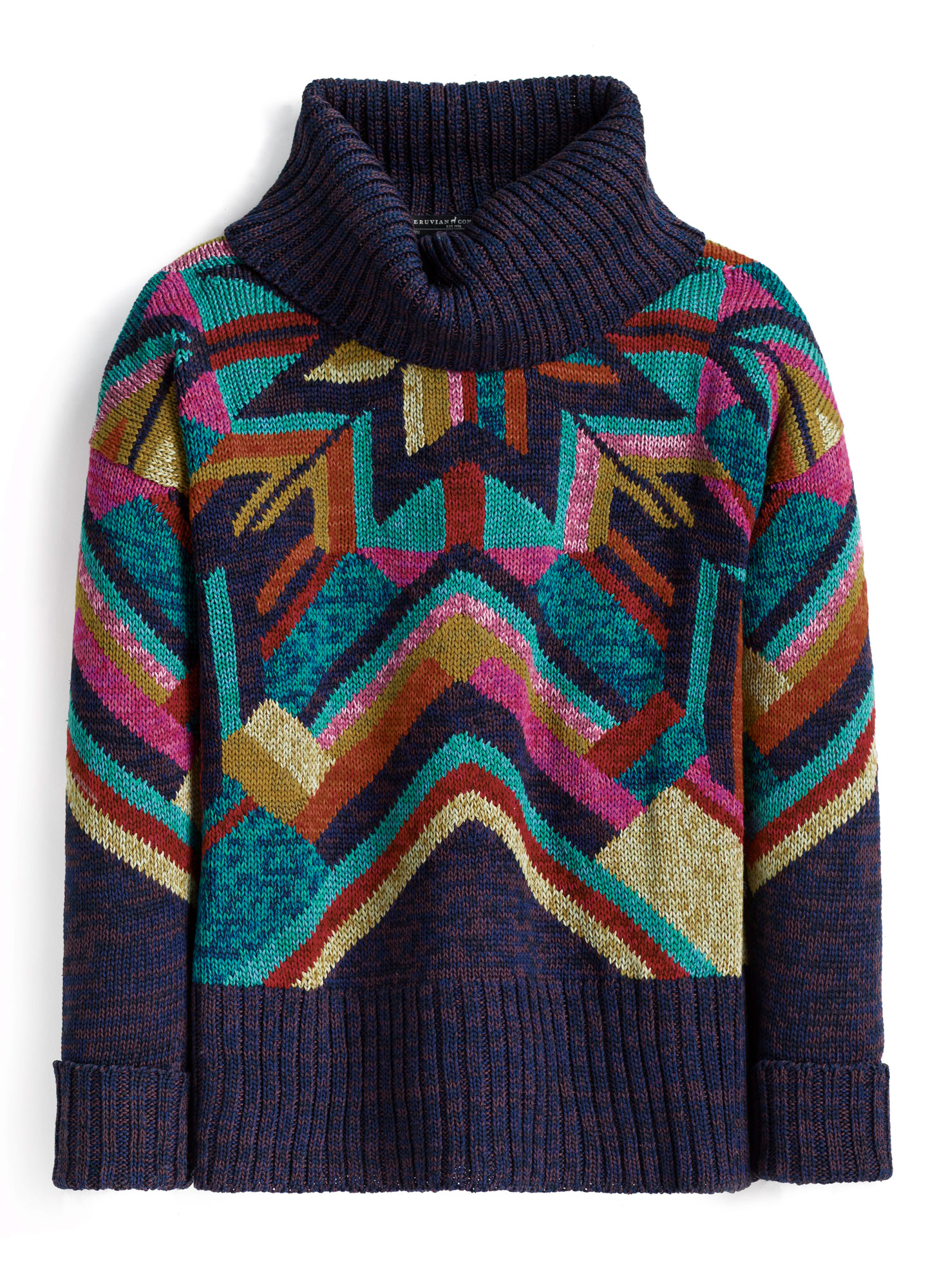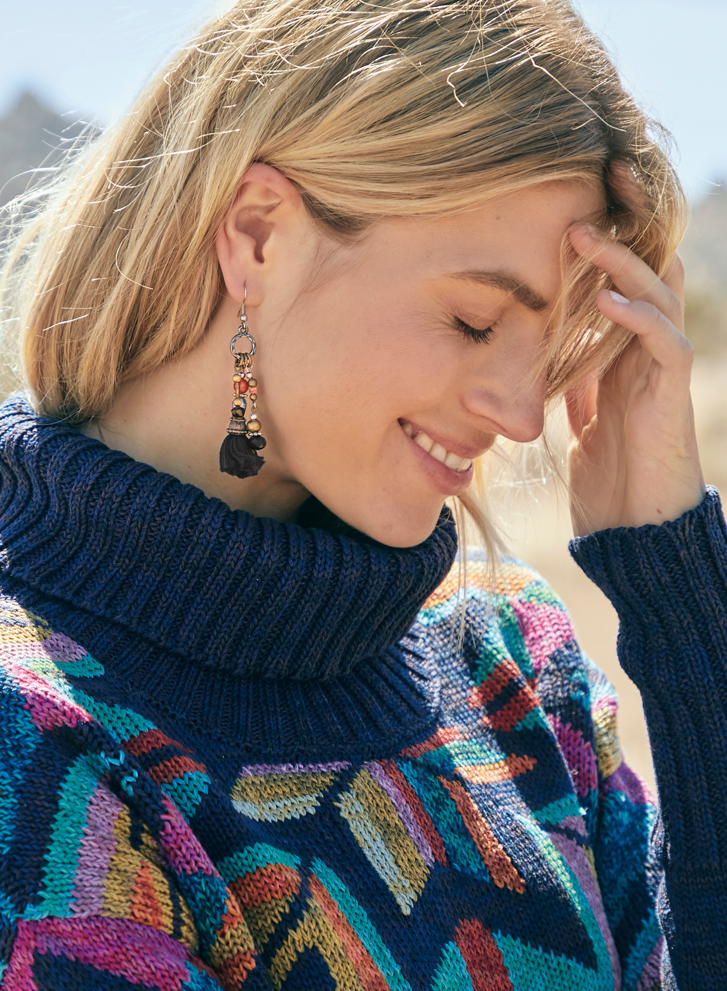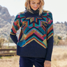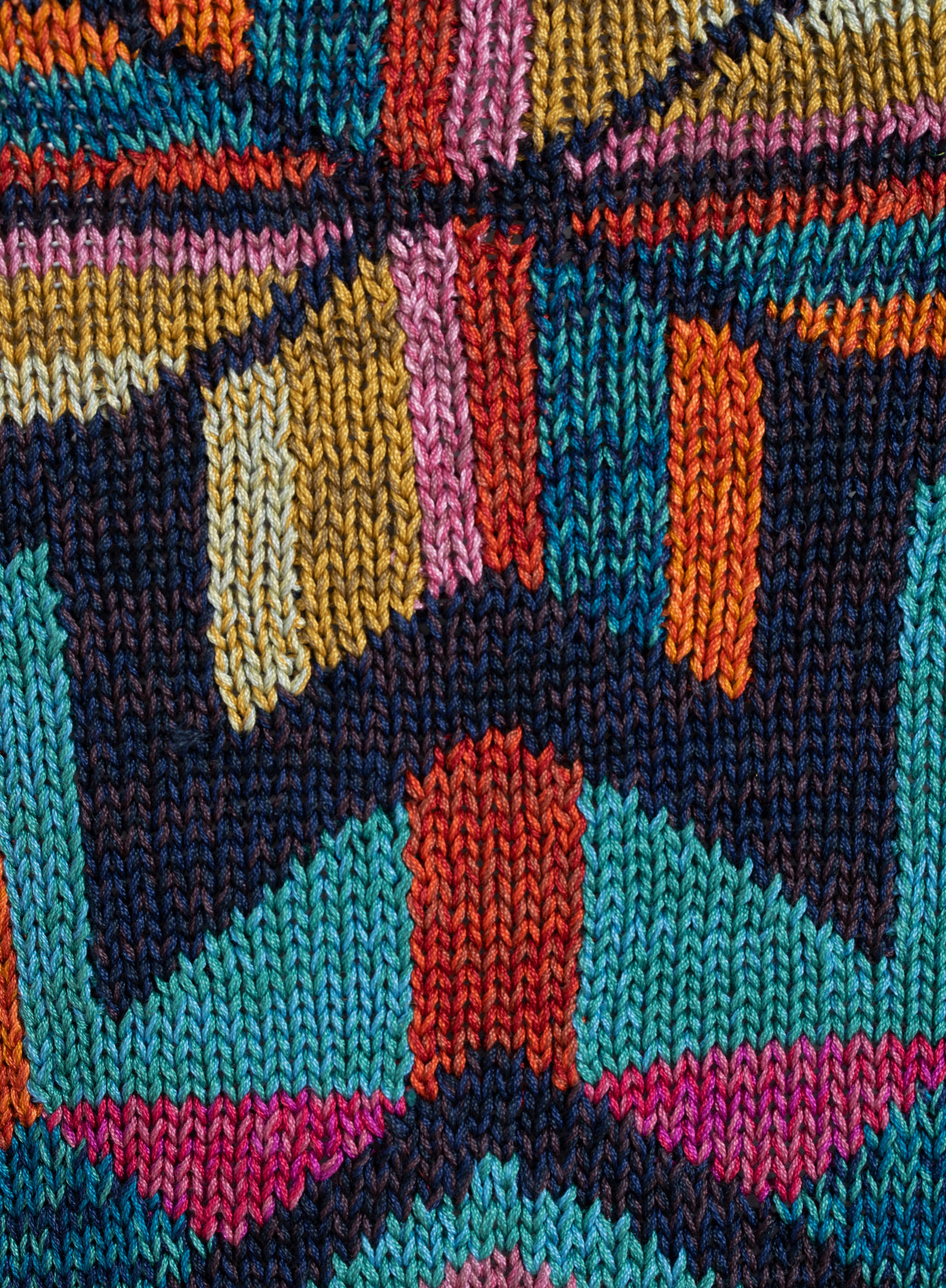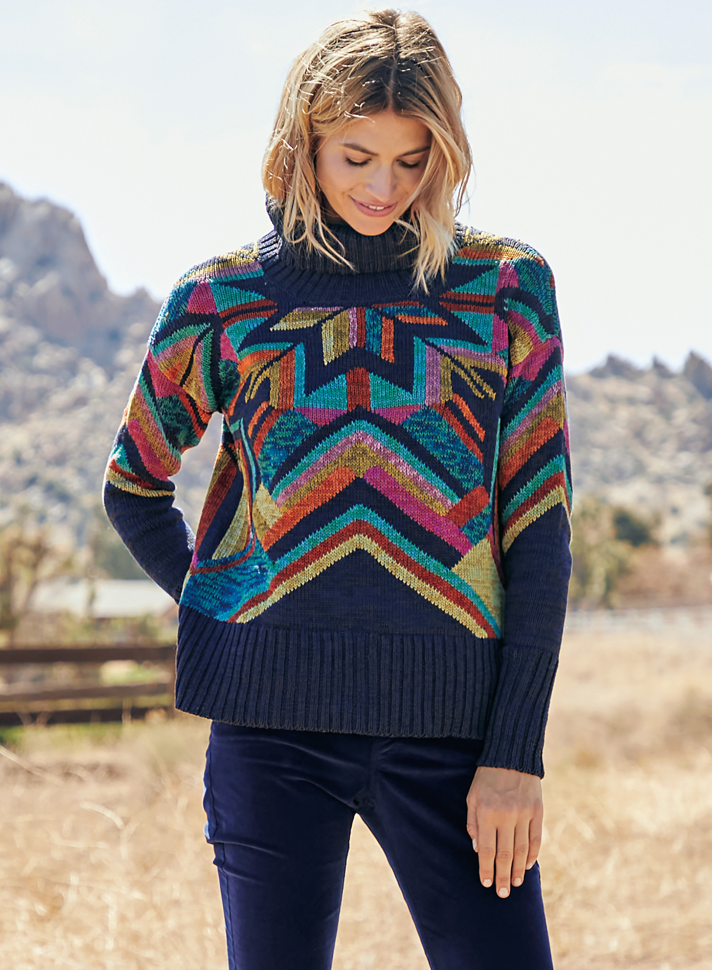 Inspired by traditional American quilts, this stunning pima art knit displays a patchwork starburst in tweeded hues of gold, paprika, pink, sky and tangerine on a ground of midnight blue. Expertly intarsia knit by hand, it has a relaxed fit, generous ribbed t-neck and chunky ribbed trim.
