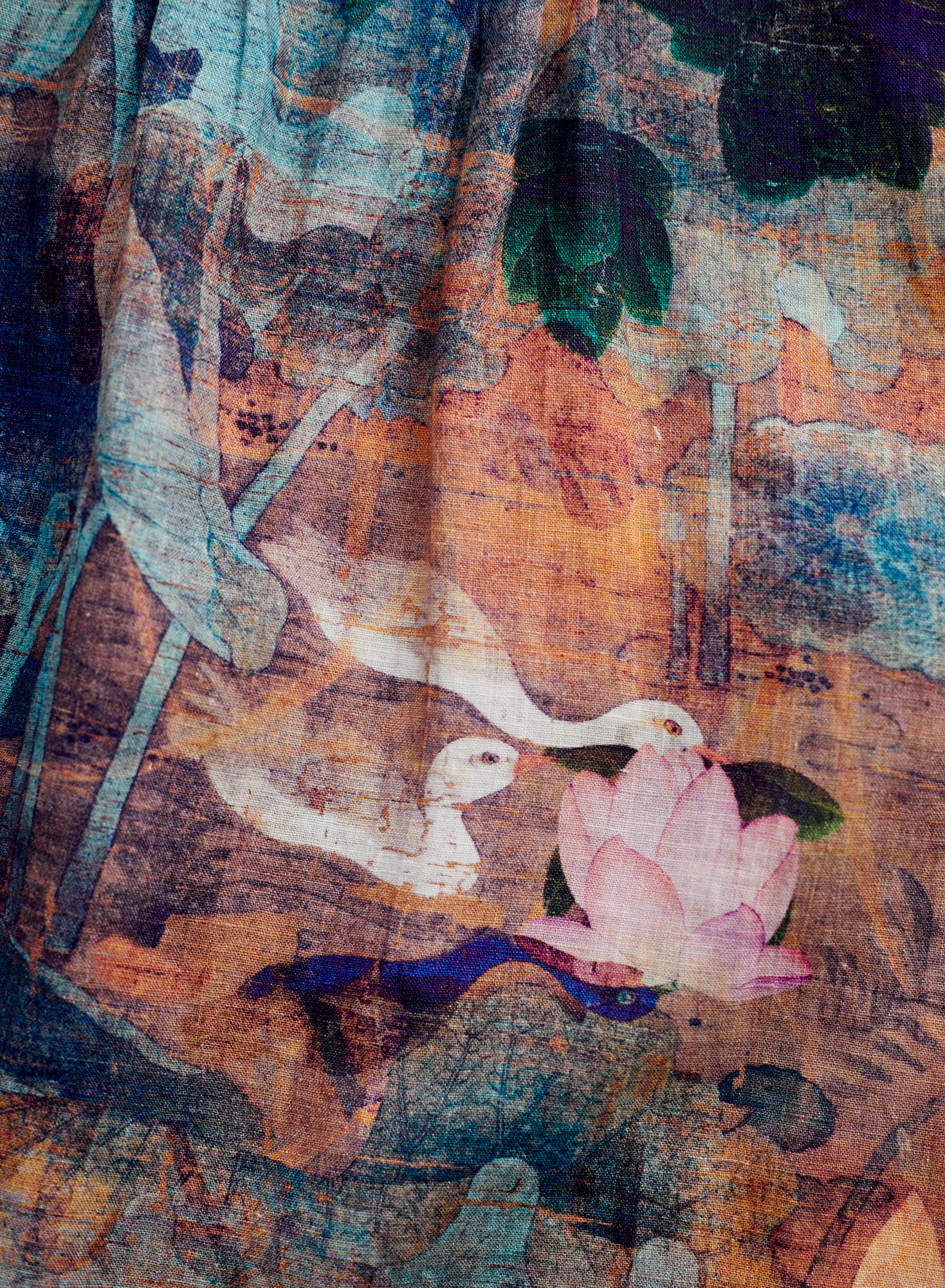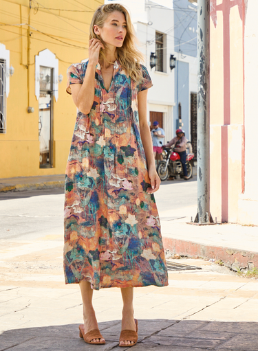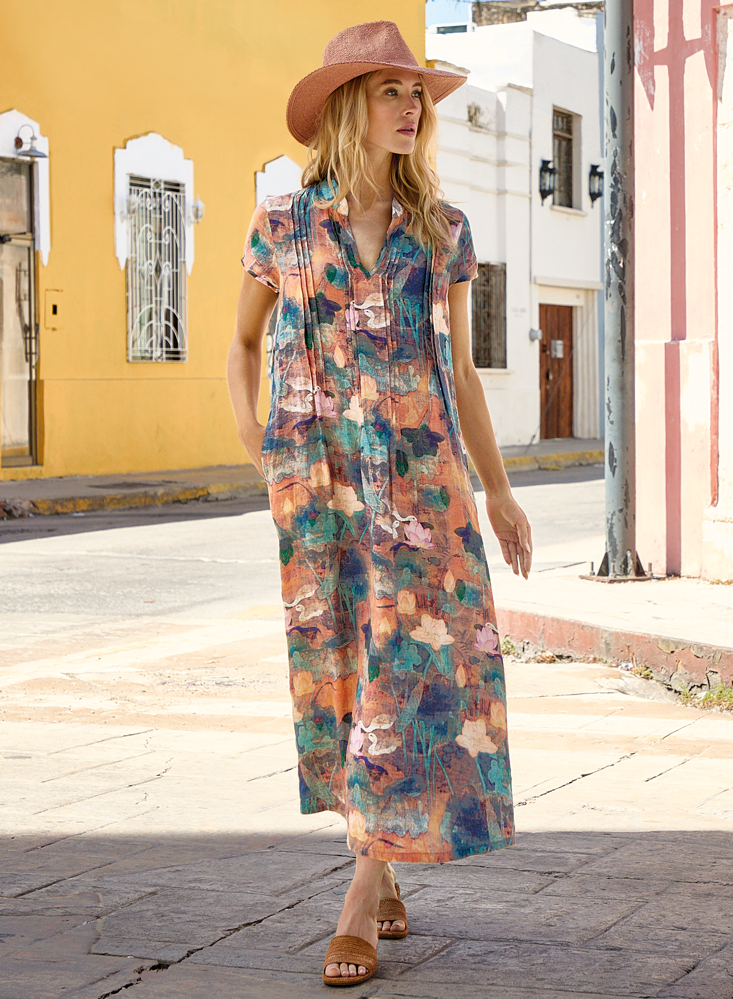 Romantic and timeless - our bestselling linen dress features pink and coral lotus blossoms and ivory swans floating across turquoise and cobalt waters. Styled with a band collar, split V-neck and pintucked bodice that releases to a flared hem; pockets.