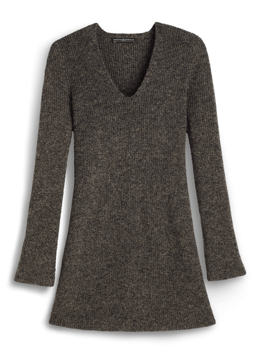 Full-fashion knit of delectably soft royal alpaca, the rib knit tunic is engineered with a deep V-neck, belled sleeves and a floataway hem.