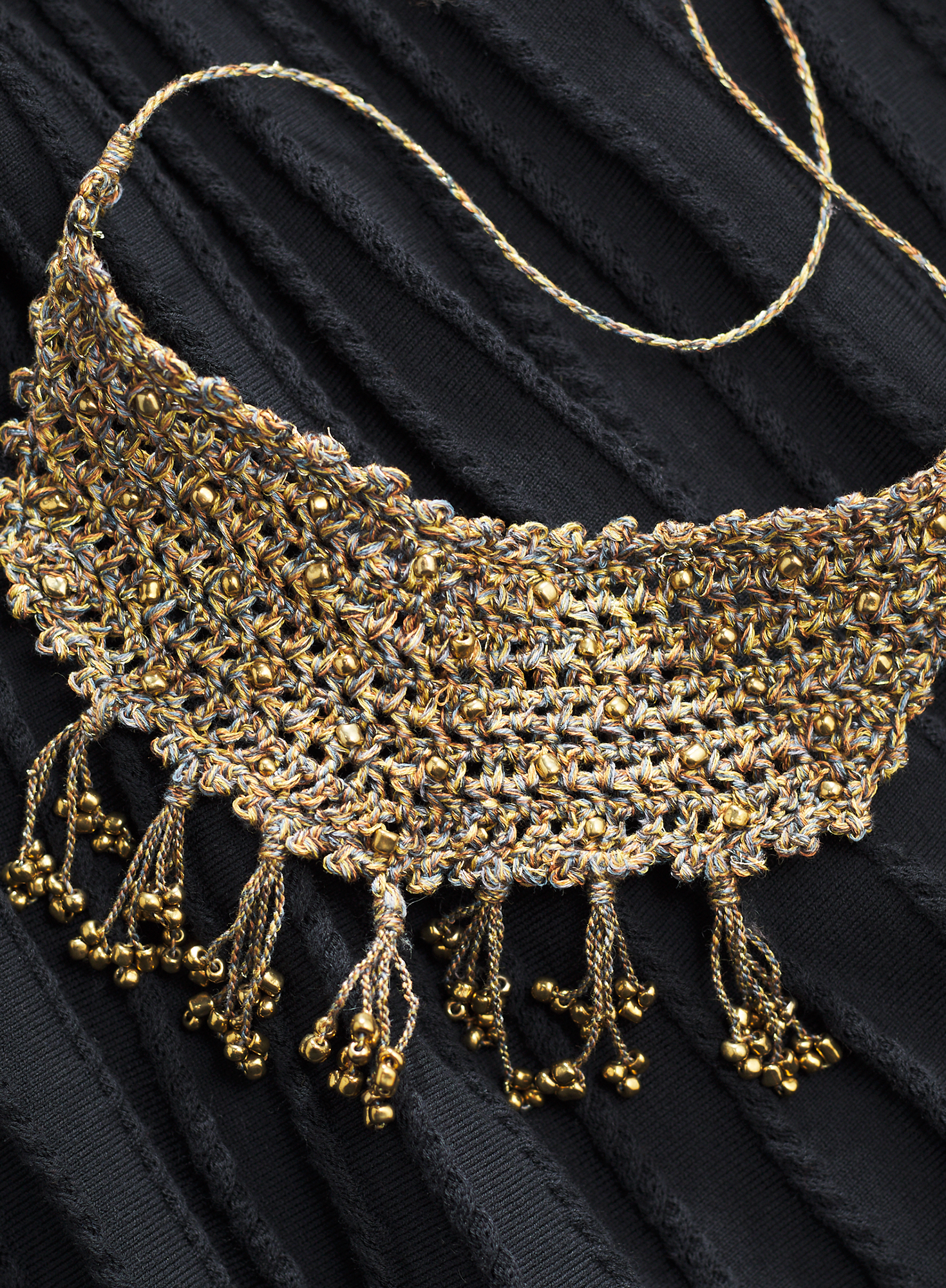 This statement-making pima collar is handcrocheted of tweeded golden yarns and finished with a row of bead-tipped tassels. Adjustable tie closures.