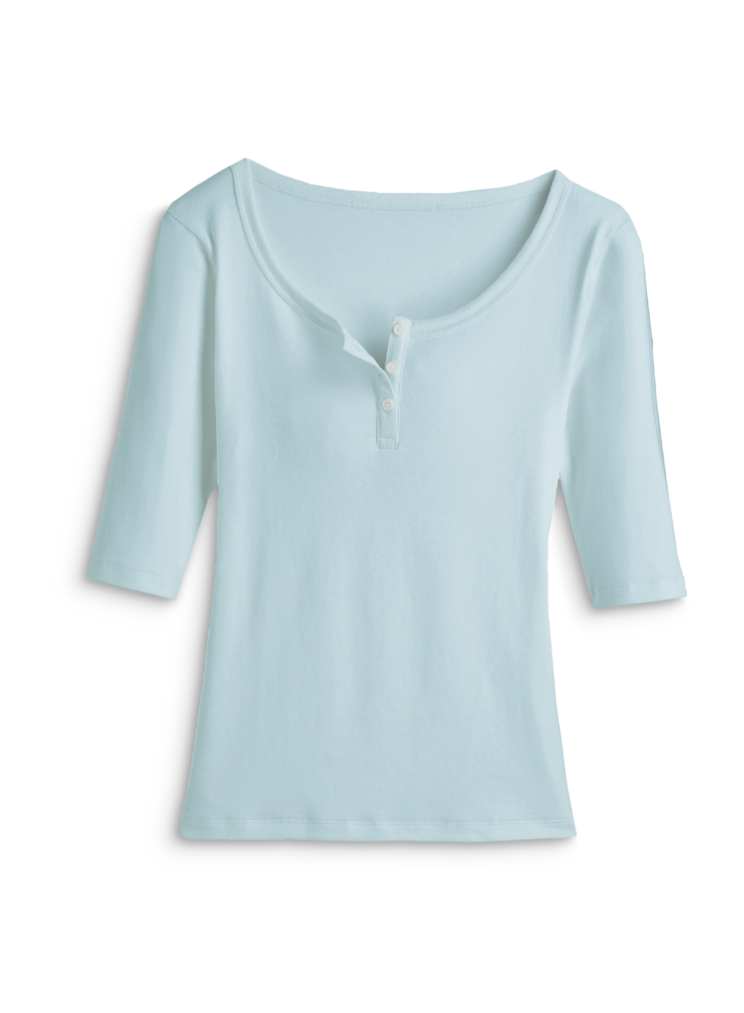Our favorite new basic top, in soft, micro-rib knit Pima cotton and spandex, features a buttoning henley U-neckline and slim elbow-sleeves.