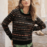 Our soft, textural, après-ski sweater is banded in delicate Fair Isle stripes in a palette of gorgeous deep pastels. Jacquard knit of frothy, hand-painted bouclé yarns grounded in black, with a crewneck and ribbed trim.