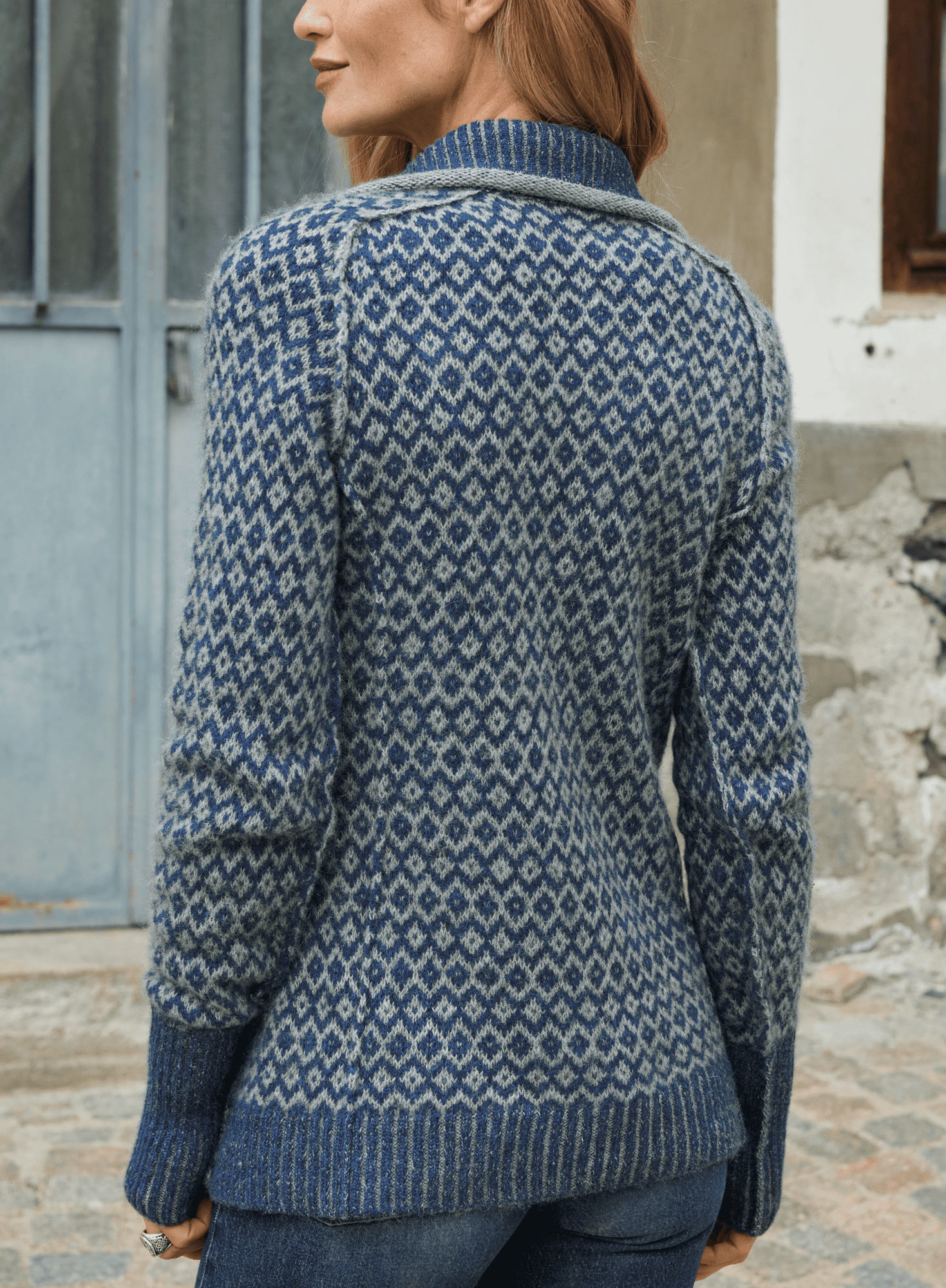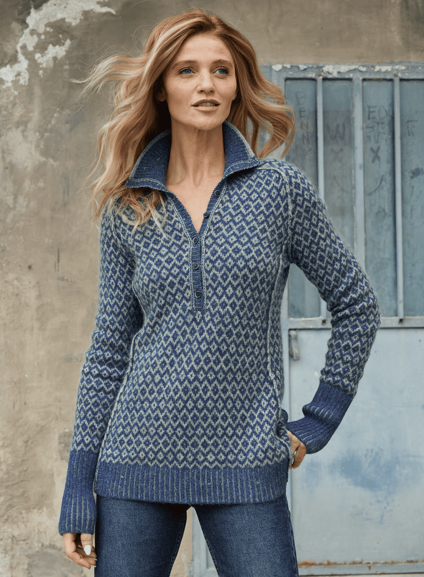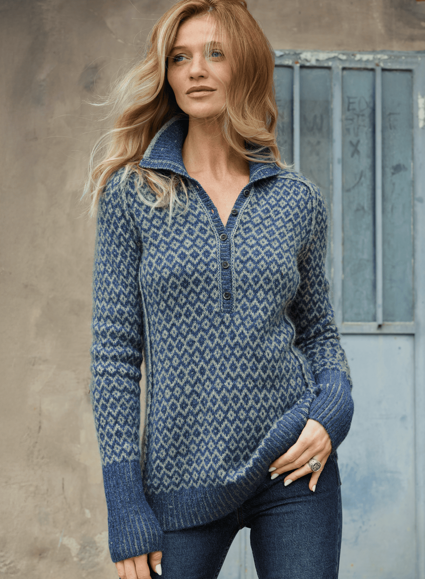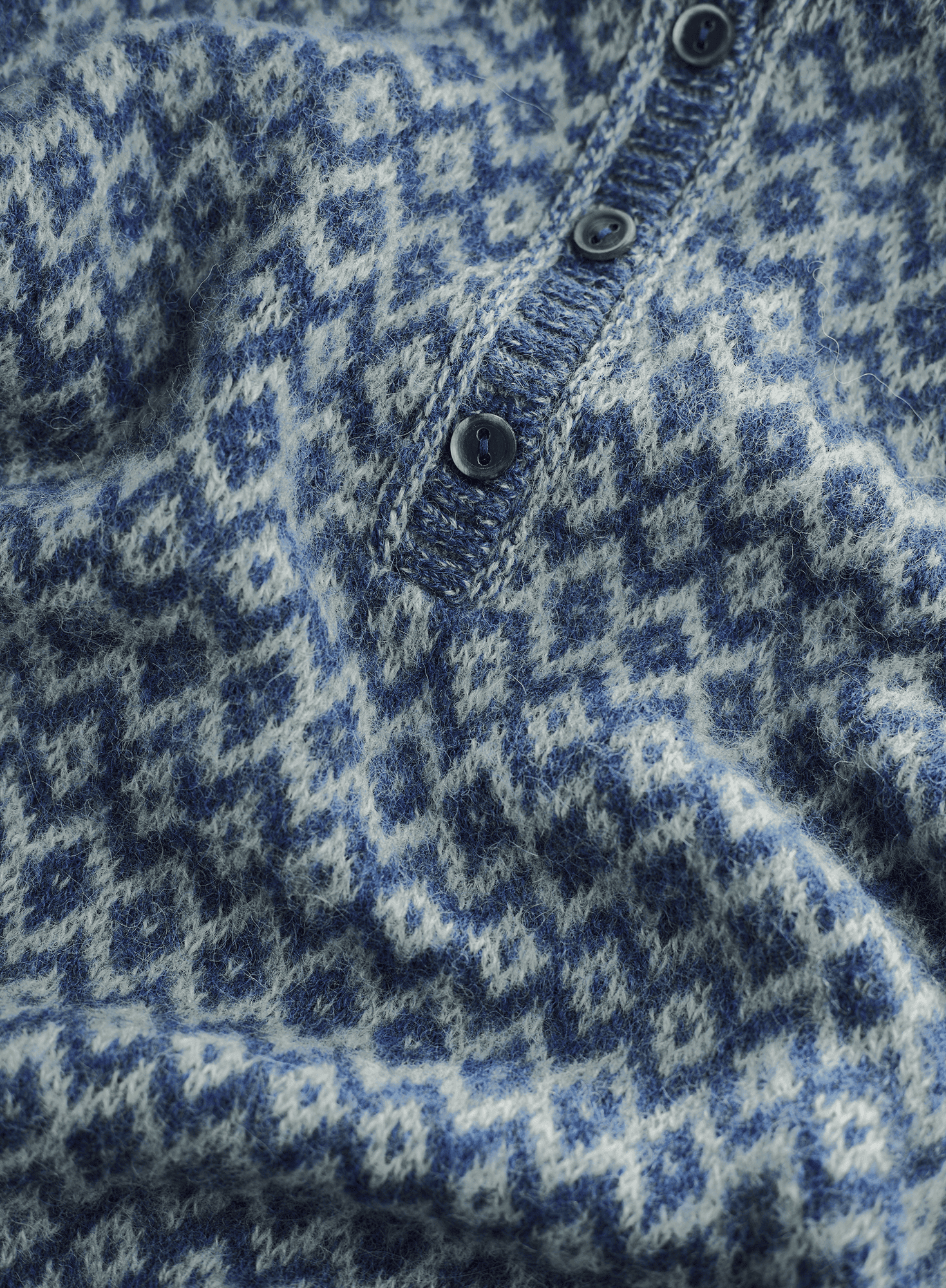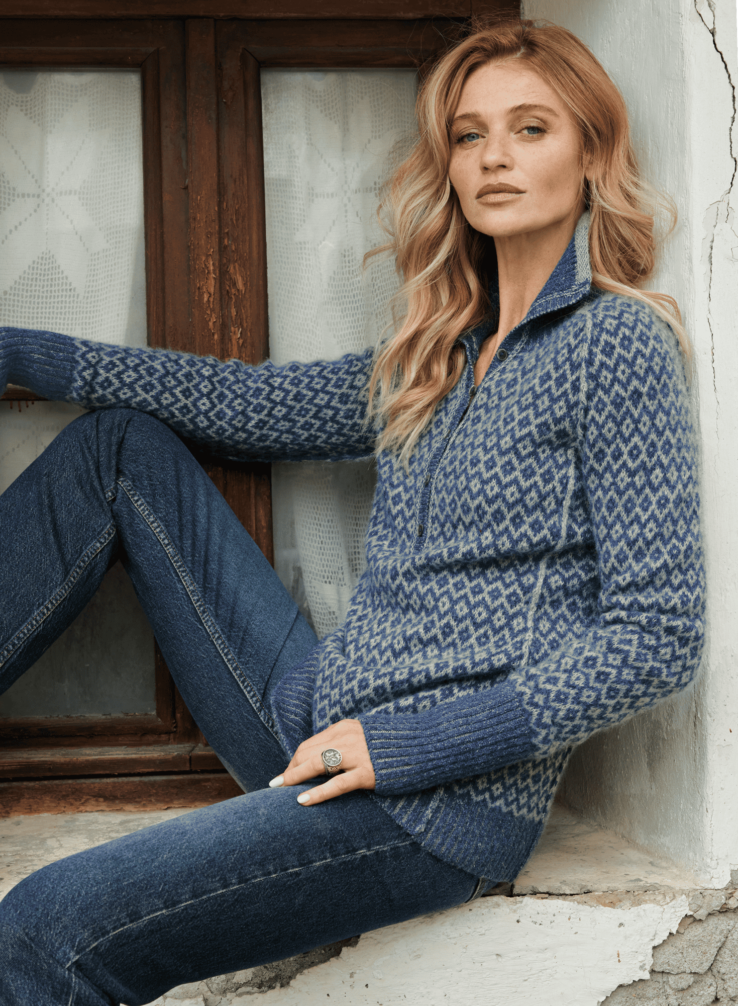 Fair Isle diamonds pattern our beloved Brimfield Henley. Full-fashion knit of cloud-soft, woollen-spun royal alpaca–the finest grade of alpaca. Unbelievably light and lofty, with a convertible mockneck, saddle shoulders, deep ribbed cuffs and contemporary exposed seams; ribbed trim.