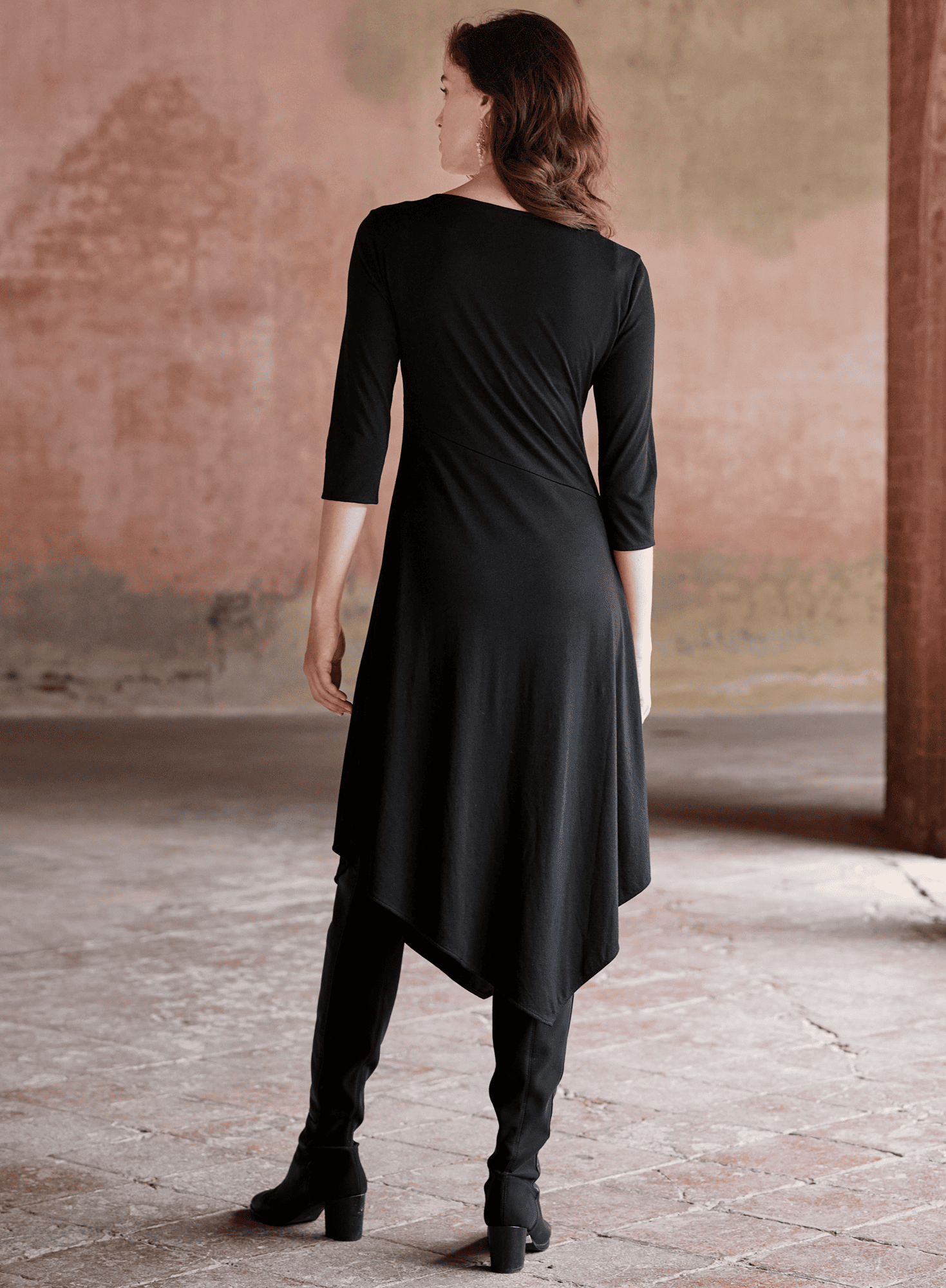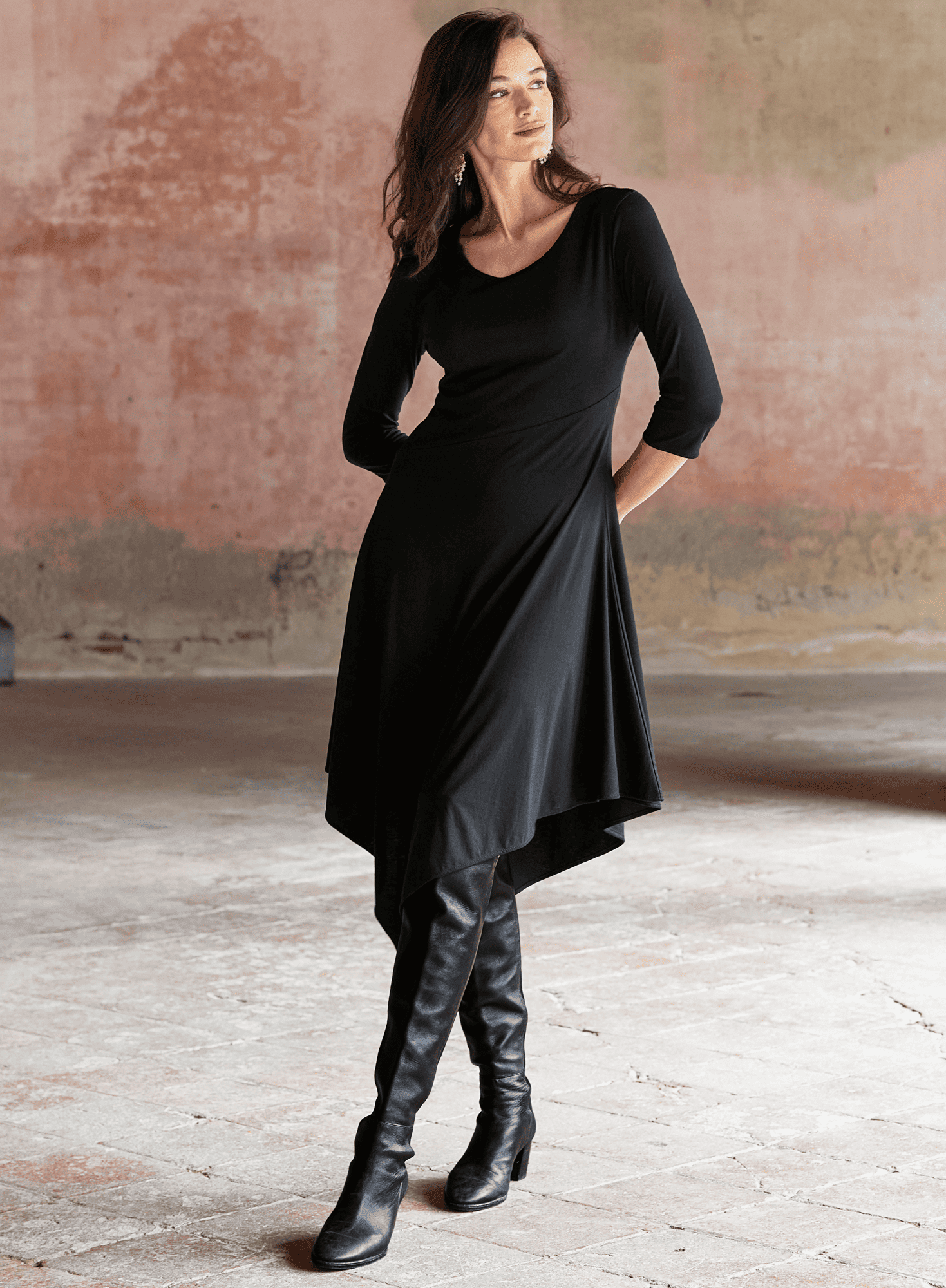 A veritable head-turner, the jersey pima and modal dress flatters the form with an asymmetrical waist seam and ¾-sleeves. The angled hem creates a striking silhouette.