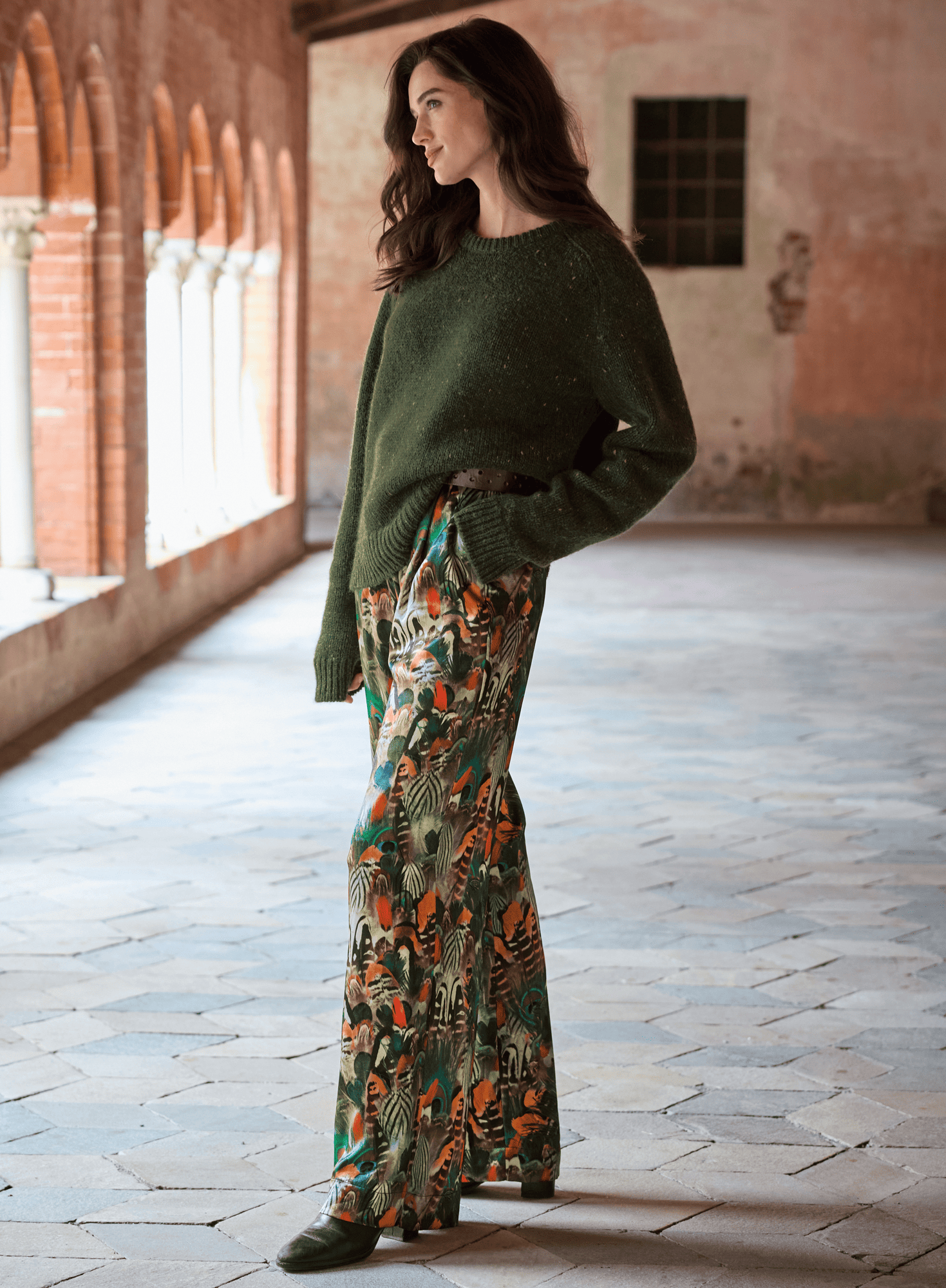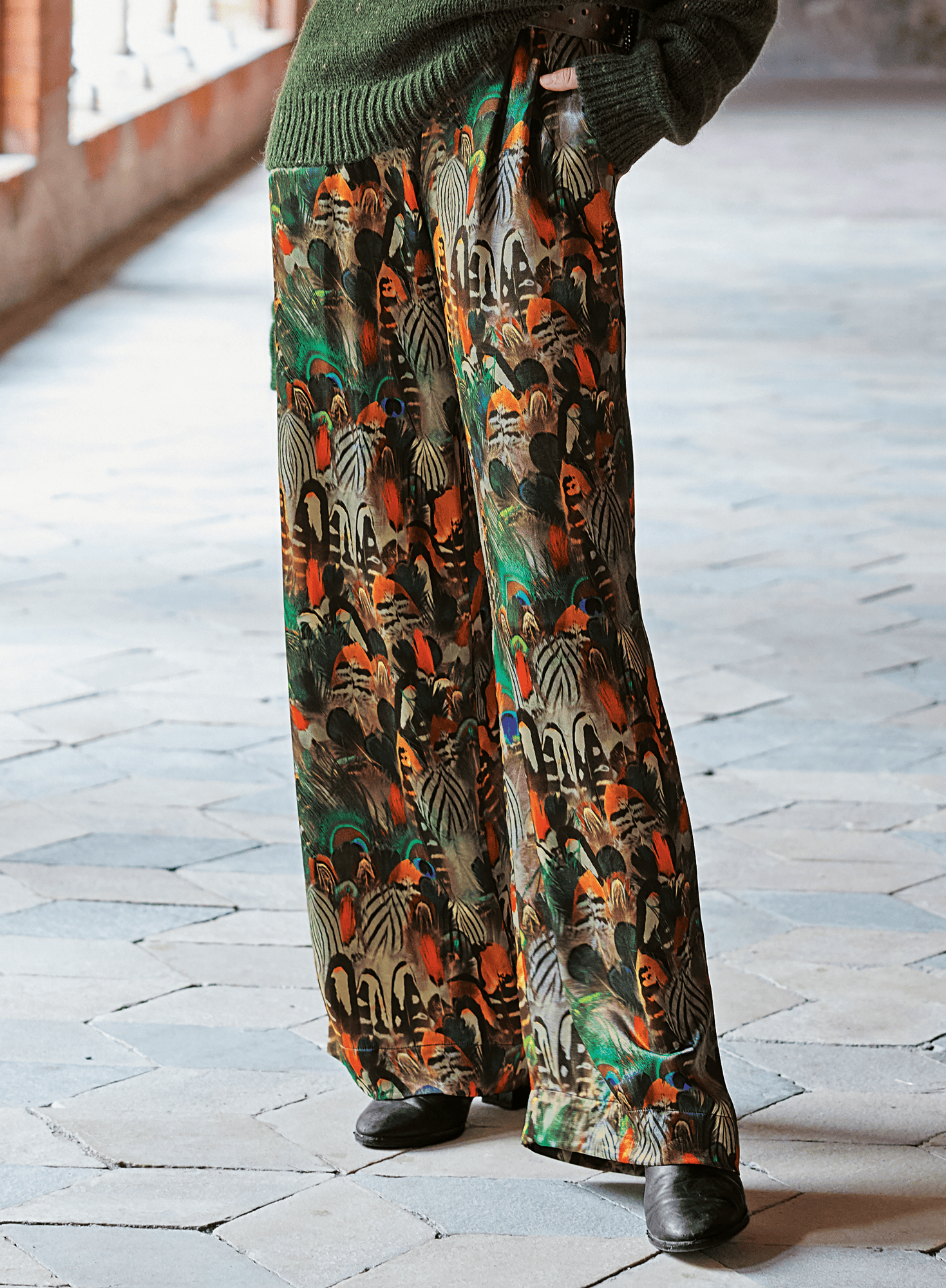A collage of brilliantly-hued French feathers floats across our relaxed wide-leg trousers in a lustrous print fabric. Tailored with a single pleat at the front waistband and comfortable elastic at the back. Pockets.