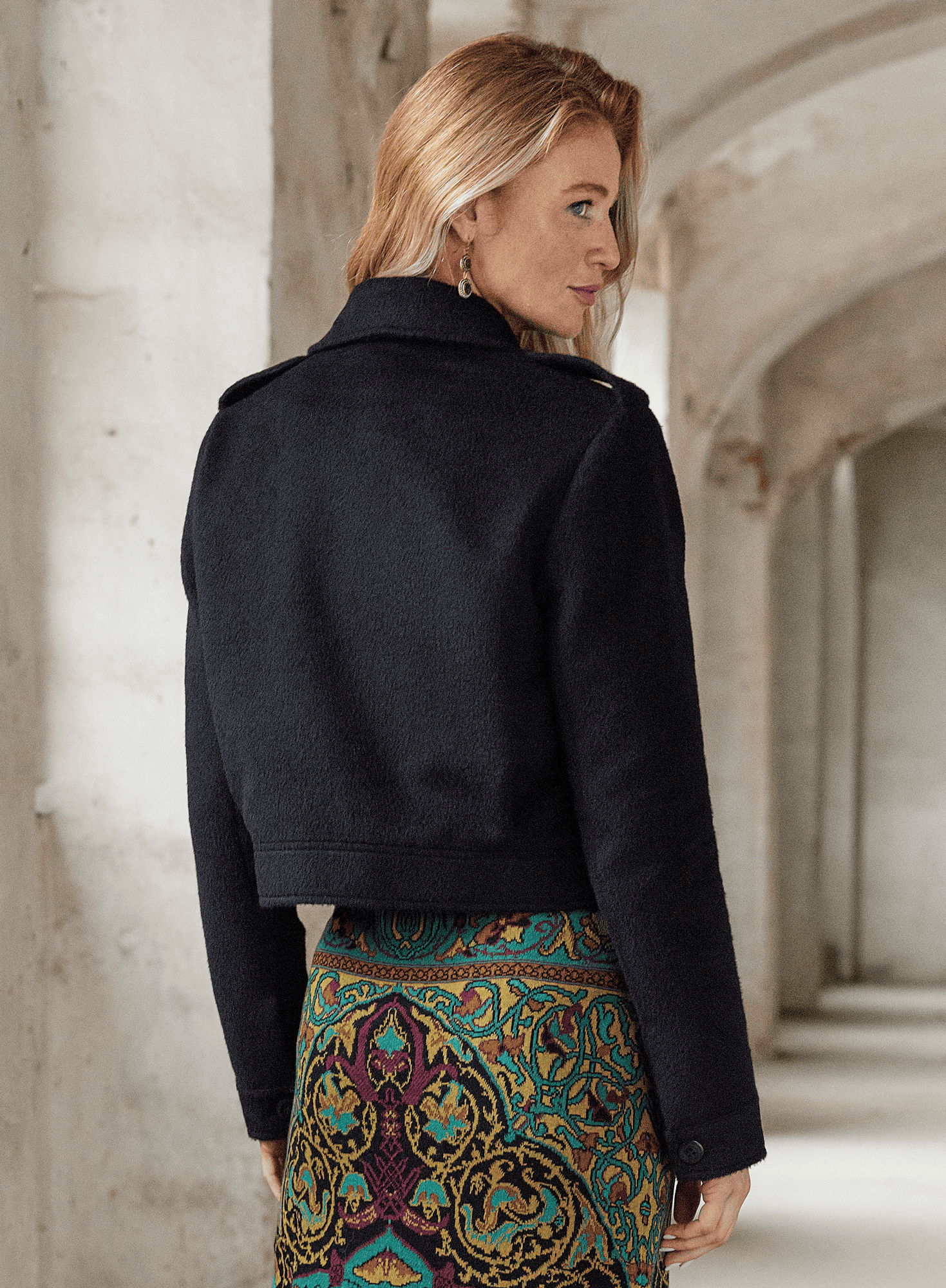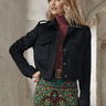 Soft and substantial in a plush baby alpaca pile, the cropped, military-influenced jacket is detailed with flap patch pockets, epaulettes and a hidden button placket. Fully lined with our signature print.