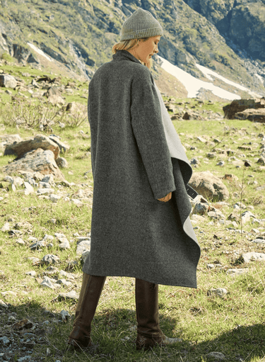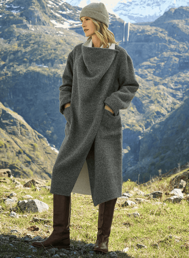 A lofty layer of luxury, our drape-collared coat is woven of double-faced alpaca and wool. The generous coat is minimally styled: unstructured and unlined, with tab button closures and patch pockets. Can be worn multiple ways; draped open, buttoned at the shoulder for enveloping warmth or closed at the waist with a drapey collar.