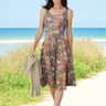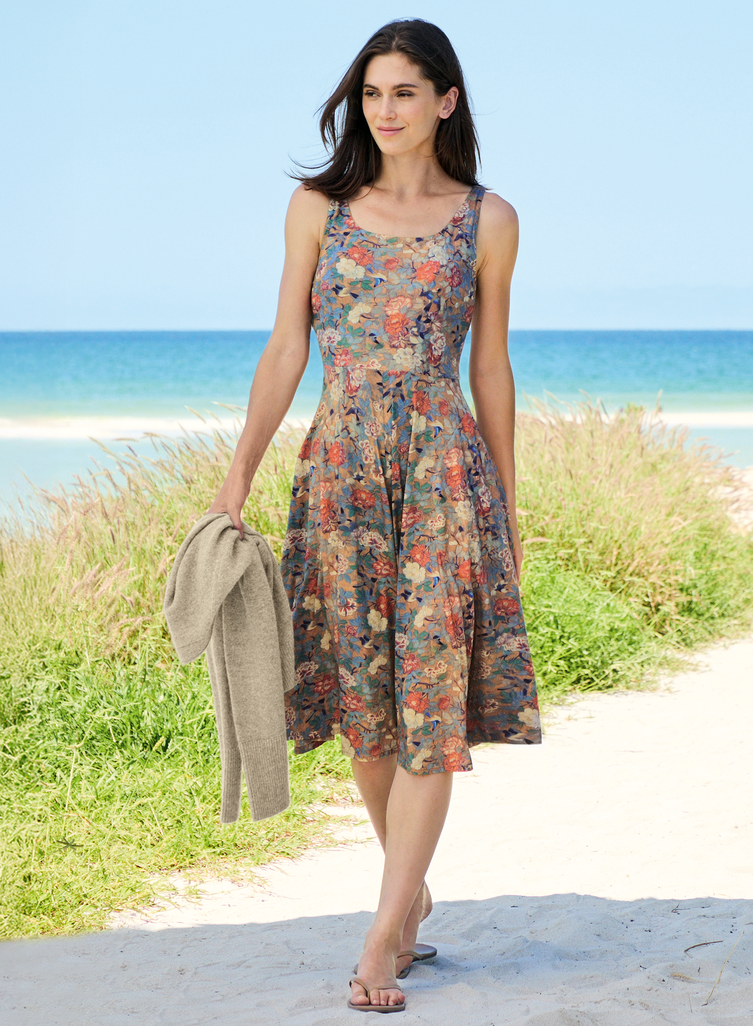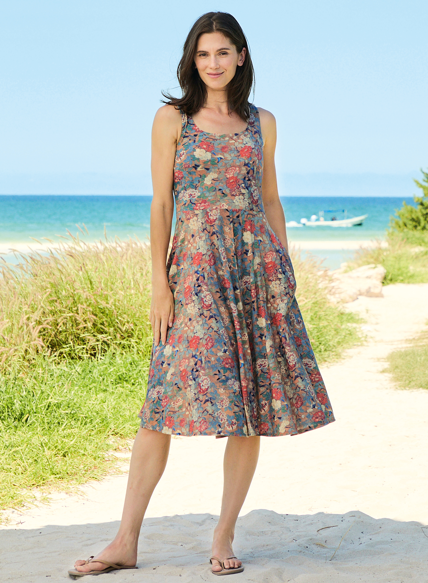 Effortless and feminine, our sleeveless, knee-length Pima cotton and modal tank dress in sky blue, cobalt and rose features a gathered waist and full skirt for soft volume and movement. Crafted in a painted floral print with birds, the double-layered top offers clean edges at the neckline and armholes, while overlock stitching at the hem adds subtle texture; pockets.