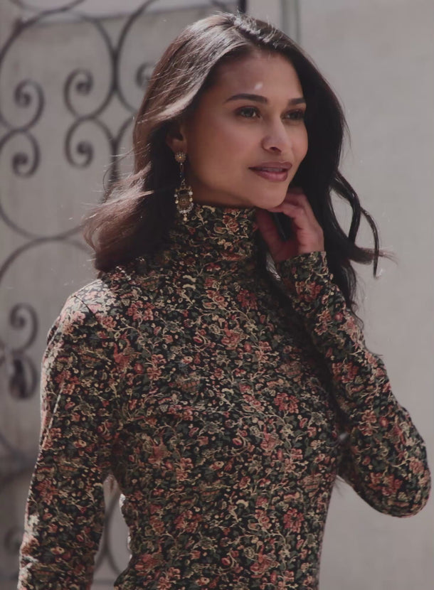 Delicate blooms from an antique French textile, in terracotta, olive, sand, and slate blue, twine across the shifting black ground of our bestselling jersey T-neck. With a scrunchable neck and shapely fit.